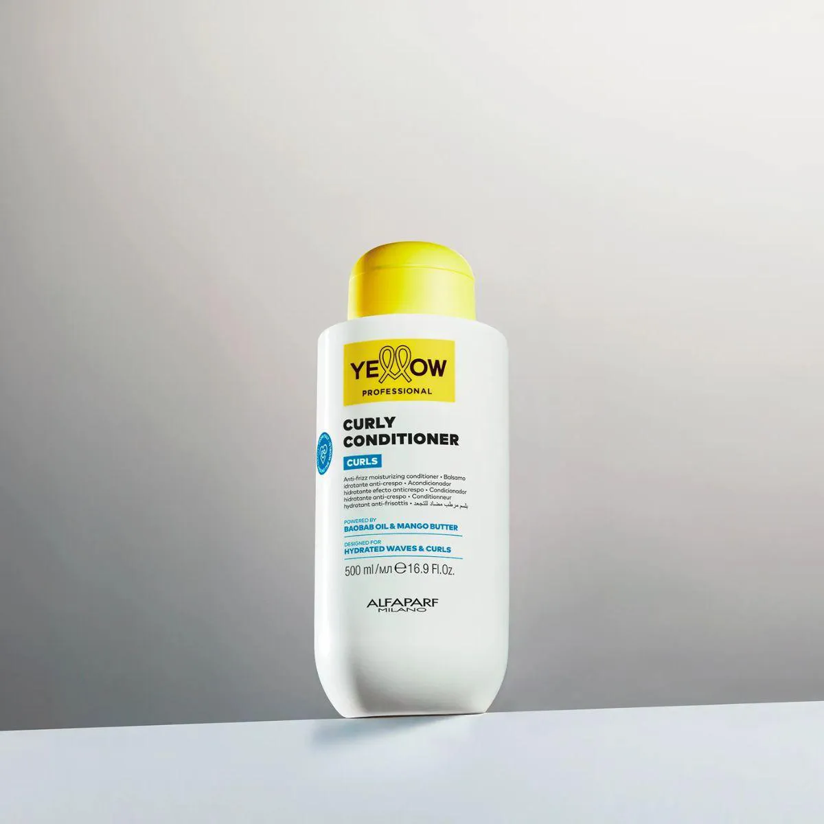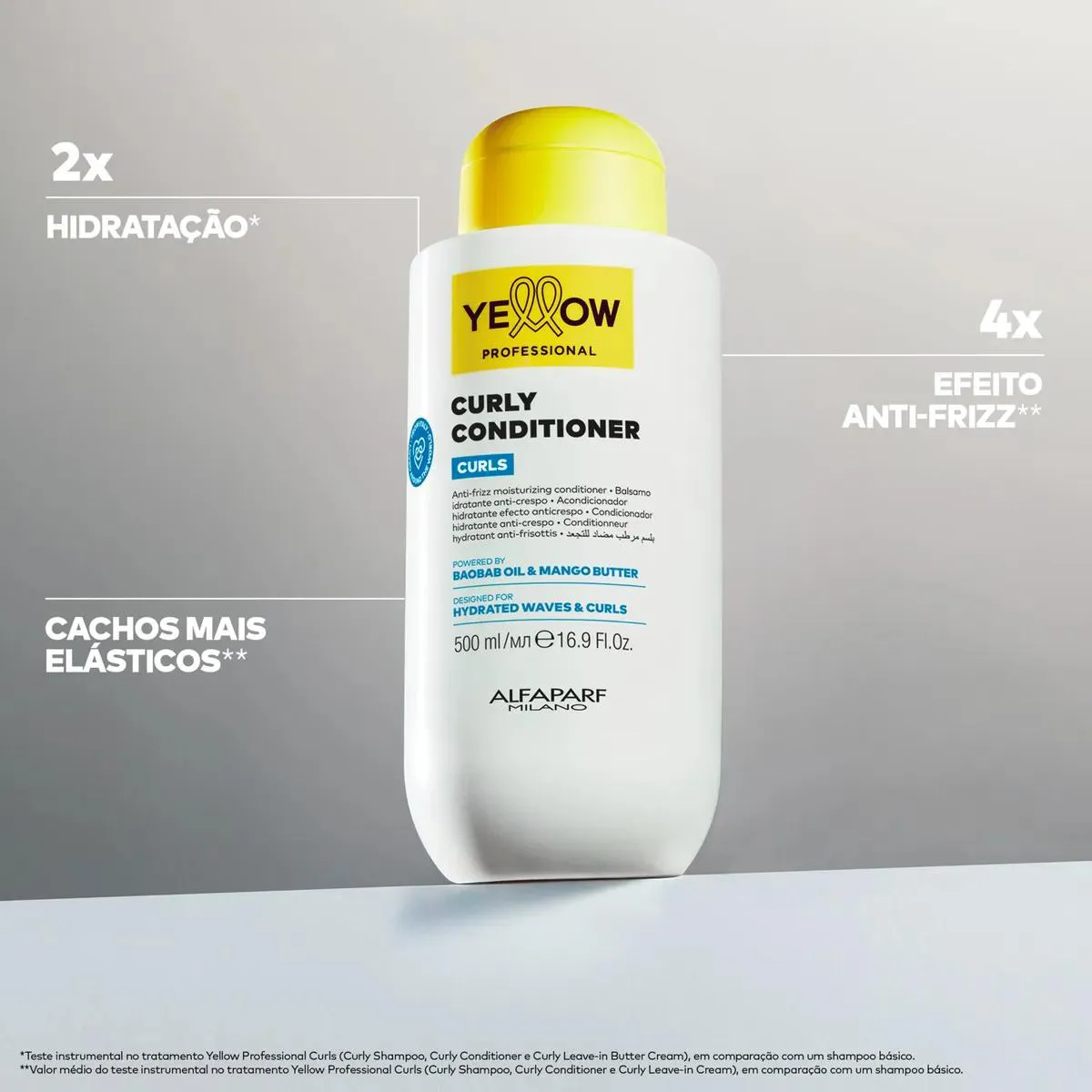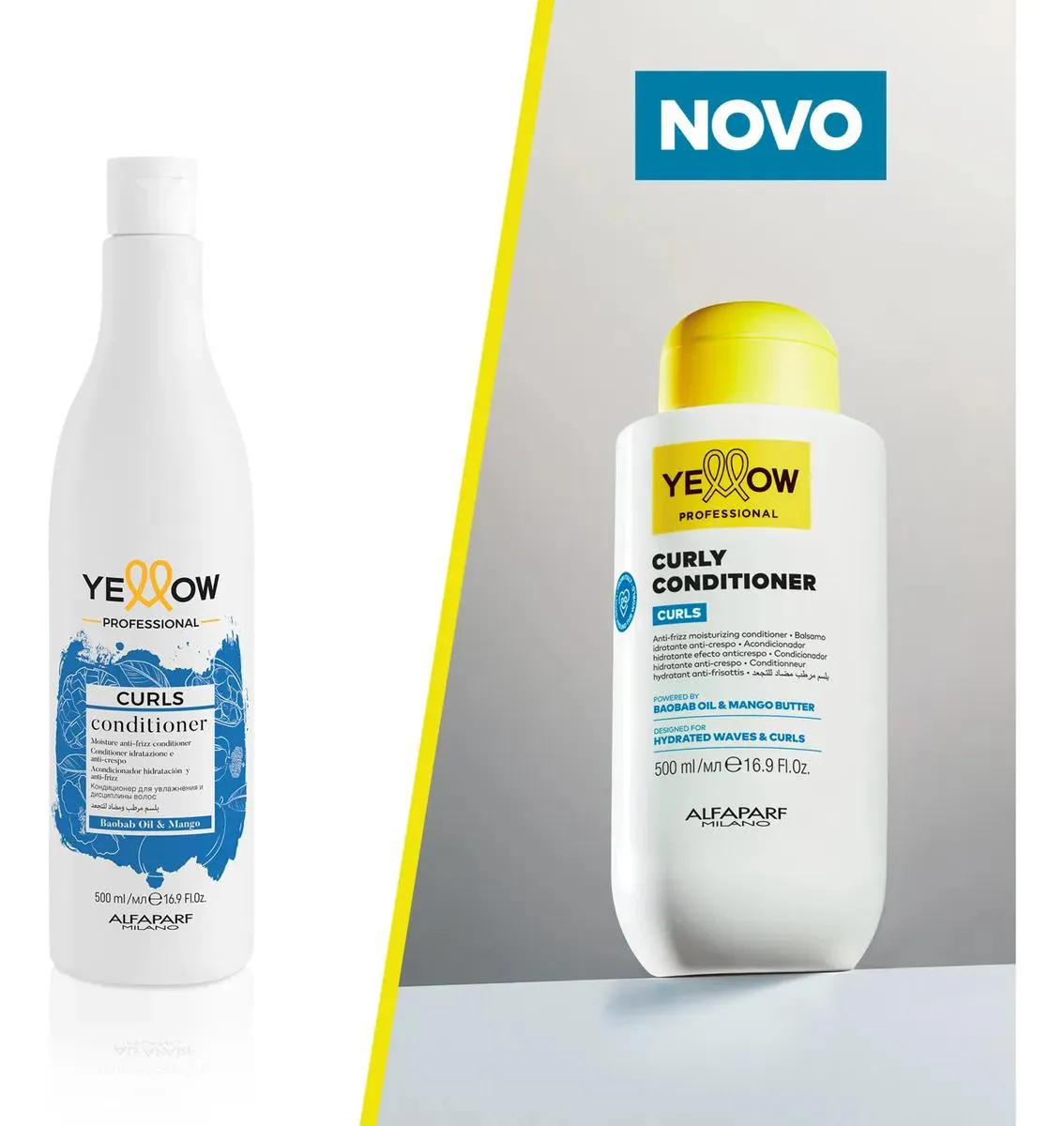 CURLY condicionador 500ML CURLS - YELLOW Descrição: TEXTURA MODULAR Condicionador hidratante anti-crespo para cabelos ondulados, cacheados e coily ALIMENTADO PELO BAOBAB OIL & MANGO BUTTER FORMULADO PARA ONDAS & CACHOS HIDRATADOS Conditioner para ondas e cachos que hidrata** e disciplina, deixando os cabelos macios e desembaraçados. **Teste instrumental realizado em cabelos tratados com Curly shampoo e Curly Conditioner. Fórmula vegana* *Livre de ingredientes de origem e derivação animal. Modo de Usar: Após o Yellow Professional Curly Shampoo, com o cabelo úmido, aplique no comprimento e nas pontas. Deixe agir por 3 minutos. Enxágue. Continue com Yellow Professional Curly Leave-in Butter Cream ou Yellow Professional Curly Leave-in Cream e para maior hidratação, use o Yellow Professional Curly Leave-in Mousse. Ingredientes: AQUA (WATER), CETEARYL ALCOHOL, GLYCERIN, PARAFFINUM LIQUIDUM (mineral OIL), COCOS NUCIFERA (COCONUT) OIL, BEHENTRIMONIUM CHLORIDE, QUATERNIUM-87, PARFUM (FRAGRANCE), DICETYLDIMONIUM CHLORIDE, PROPYLENE GLYCOL, AMODIMETHICONE, PHENOXYETHANOL, ISOPROPYL ALCOHOL, ETHYLHEXYLGLYCERIN, ADANSONIA DIGITATA SEED OIL, DISODIUM EDTA, MANGIFERA INDICA (MANGO) SEED BUTTER, HEXAMETHYLINDANOPYRAN, CETRIMONIUM CHLORIDE, TRIDECETH-10, TETRAMETHYL ACETYLOCTAHYDRONAPHTHALENES, TERPINEOL, DIMETHYL PHENETHYL ACETATE, ETHYLHEXYL METHOXYCINNAMATE, ALOE BARBADENSIS LEAF JUICE, LACTIC ACID, HYDROLYZED WHEAT PROTEIN, SODIUM BENZOATE, POTASSIUM SORBATE