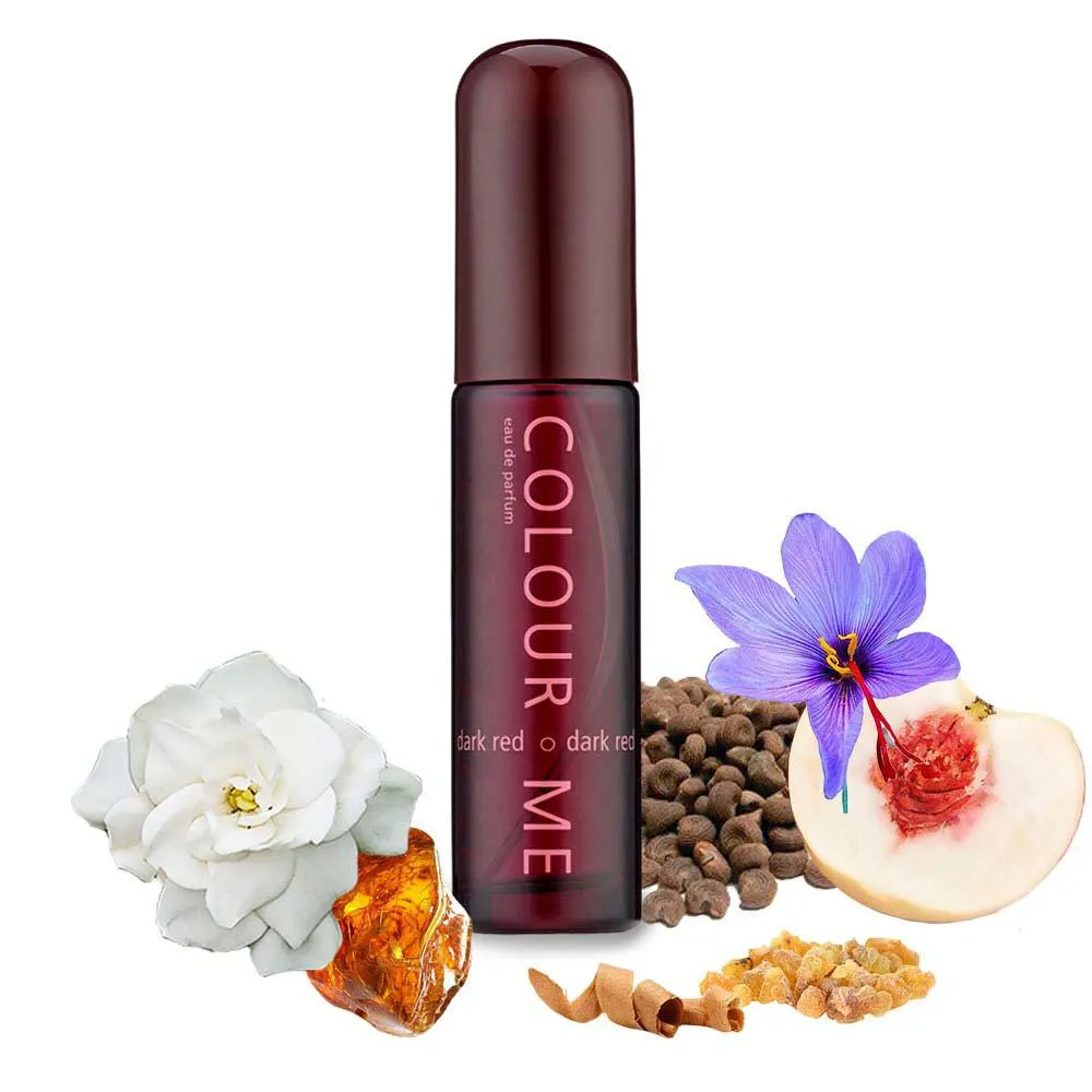 Dark Red Colour Me Femme é uma fragrância Sofisticada e elegante com notas de cabeça predominantemente cítricas e de frutas frescas em um rico acorde floral de jasmim. As notas de coração são âmbares quentes, açafrão e cedro, todas sustentadas por notas de base tenazes de ricas resinas e almíscares.