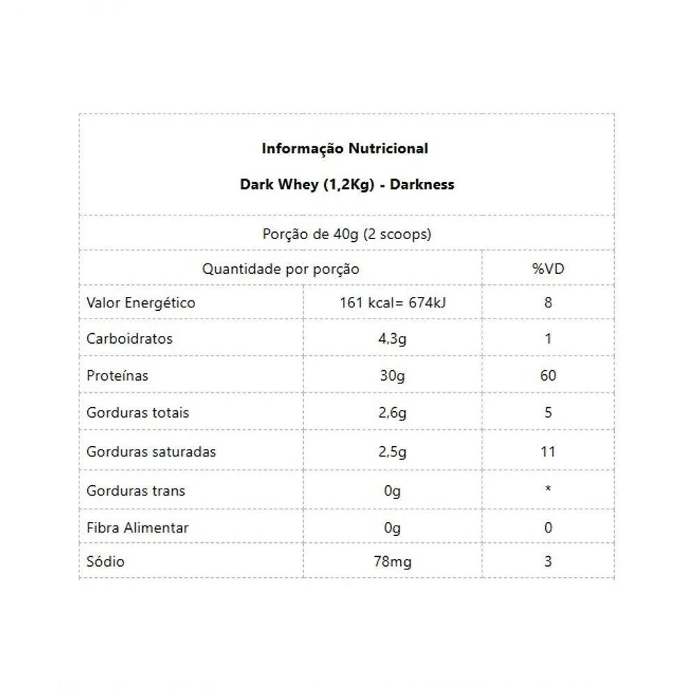 Informação Nutricional Dark Whey (900g) - DarknessPorções por embalagens: cerca de 23Porção de 40g (2 scoops)Quantidade por porção%VDValor Energético1632kcal8Carboidratos3,6g1Açúcares totais2,3g Açúcares adicionados0g Proteínas29gmg60Histidina 556mg Isoleucina 1759mg Leucina 3072mg Lisina 2708mg Cisteína 645mg Metionina 627mg Tirosina 938mg Fenilalanina 1004mg Treonina 2048mg triptofano 529mg Valina 1720mg Ácido aspártico3108mg Serina 1544mg Ácido glutâmico5302mg Glicina 559mg Alanina 1421mg Arginina 798mg Prolina 1775mg Gorduras totais2,6g4Gorduras saturadas1,3g7Gorduras trans0g0Fibras alimentares0g2Sódio 83mg4* Porcentual de valores diários fornecidos pela porção. Obs: Pode haver pequenas variações na informação nutricional de acordo com o sabor.