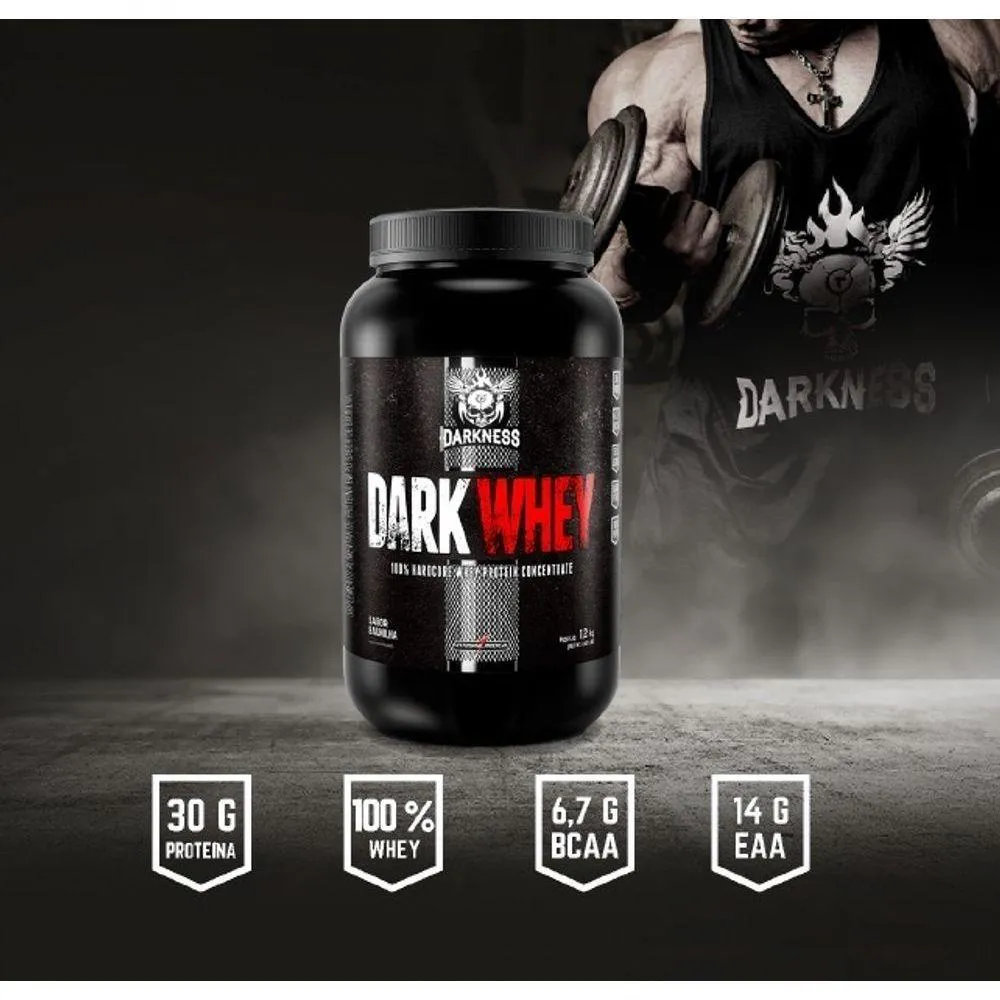 Dark Whey (900g) - Darkness A alta tecnologia de produção Darkness apresenta mais um aliado para os atletas e praticantes de musculação intensa. Dark Whey é um suplemento proteico de alta qualidade, que promove elevada oferta de aminoácidos essenciais de forma prática e saborosa. Por ser um produto estritamente proteico, sem adição de outros nutrientes, pode ser utilizado para modular a ingestão diária de proteínas dos atletas de acordo com suas necessidades, ou seja, consumido puro ou combinado com outros ingredientes. Níveis de intensidade e esforço inatingíveis para a maioria são rotina para os autênticos bodybuilders. Com disciplina ferrenha eles mantêm sob controle cada aspecto do seu desenvolvimento: dieta, treino e foco mental. A linha Darkness traz uma gama de produtos formulados com os ativos primordiais e as altas concentrações exigidas por esses atletas, que buscam hipertrofia e definição em níveis máximos. BENEFÍCIOS: * Até 30g de proteínas;* 3,0g de Leucina;* 100% WPC;* 6,2 g de bcaa;* Ganho de força e massa muscular;* Maior desempenho;* Melhor recuperação Muscular;* Aporte proteico para dietas de emagrecimento.