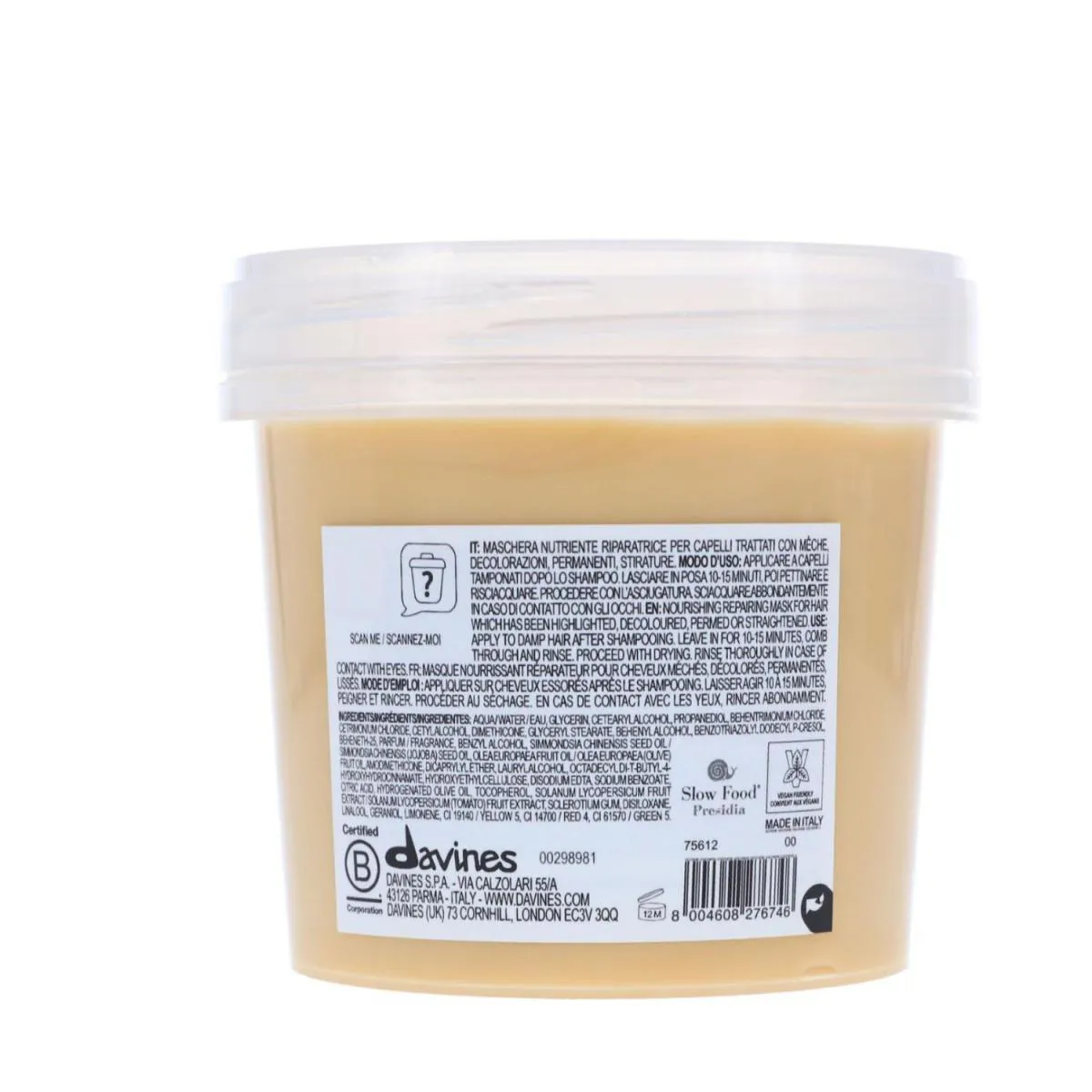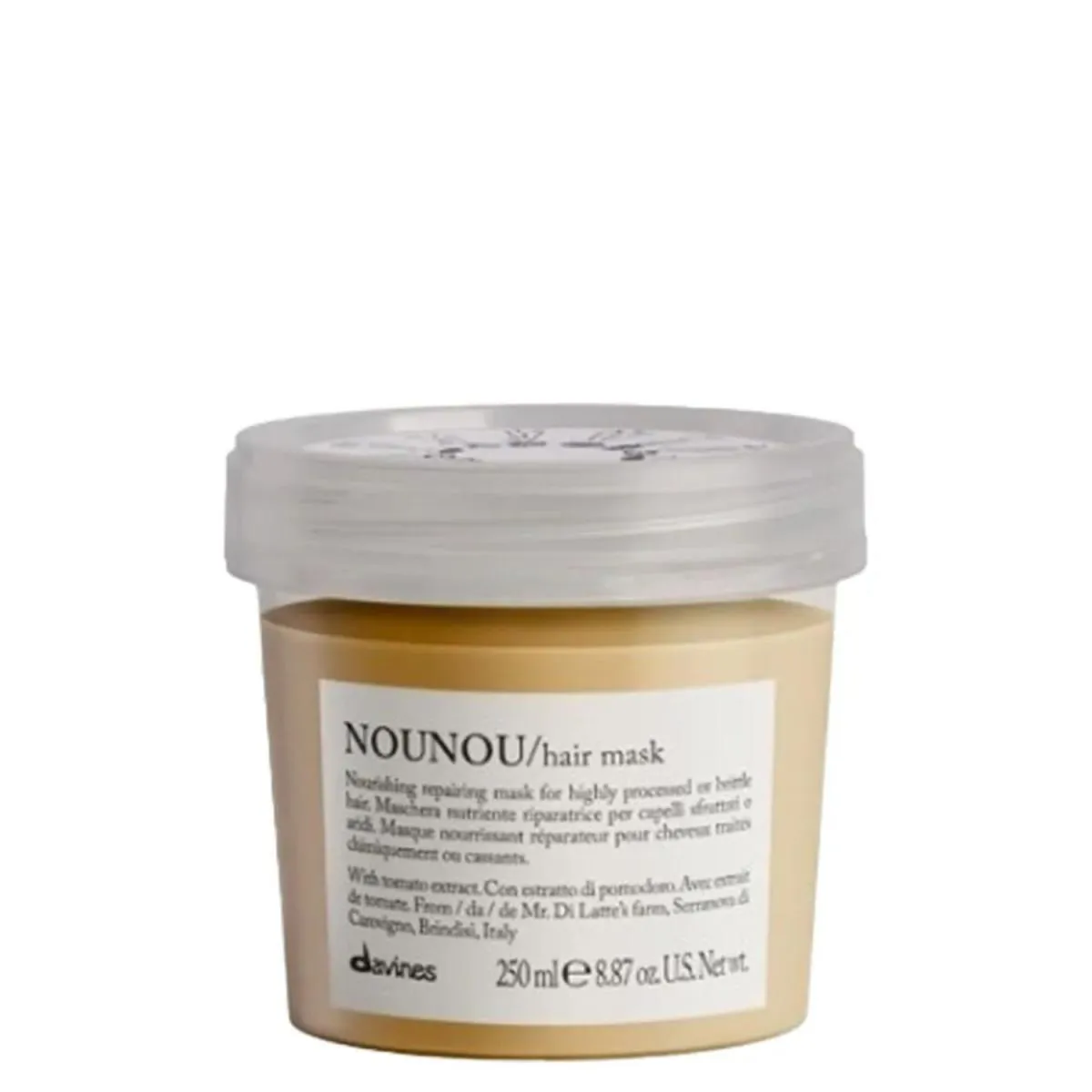 A Máscara de Reparação Davines Essential Haircare Nounou com 250 ml, hidrata e encorpa os fios novamente, nutrindo-os profundamente, proporciona cabelos sedosos, sem ficarem pesados.Máscara reparadora para cabelos descoloridos, com permanente ou relaxamento. Composto por extrato de tomate Fiaschetto, rico em carboidratos e proteínas. O seu extrato provém da polpa que contém propriedades tonificantes e nutritivas.