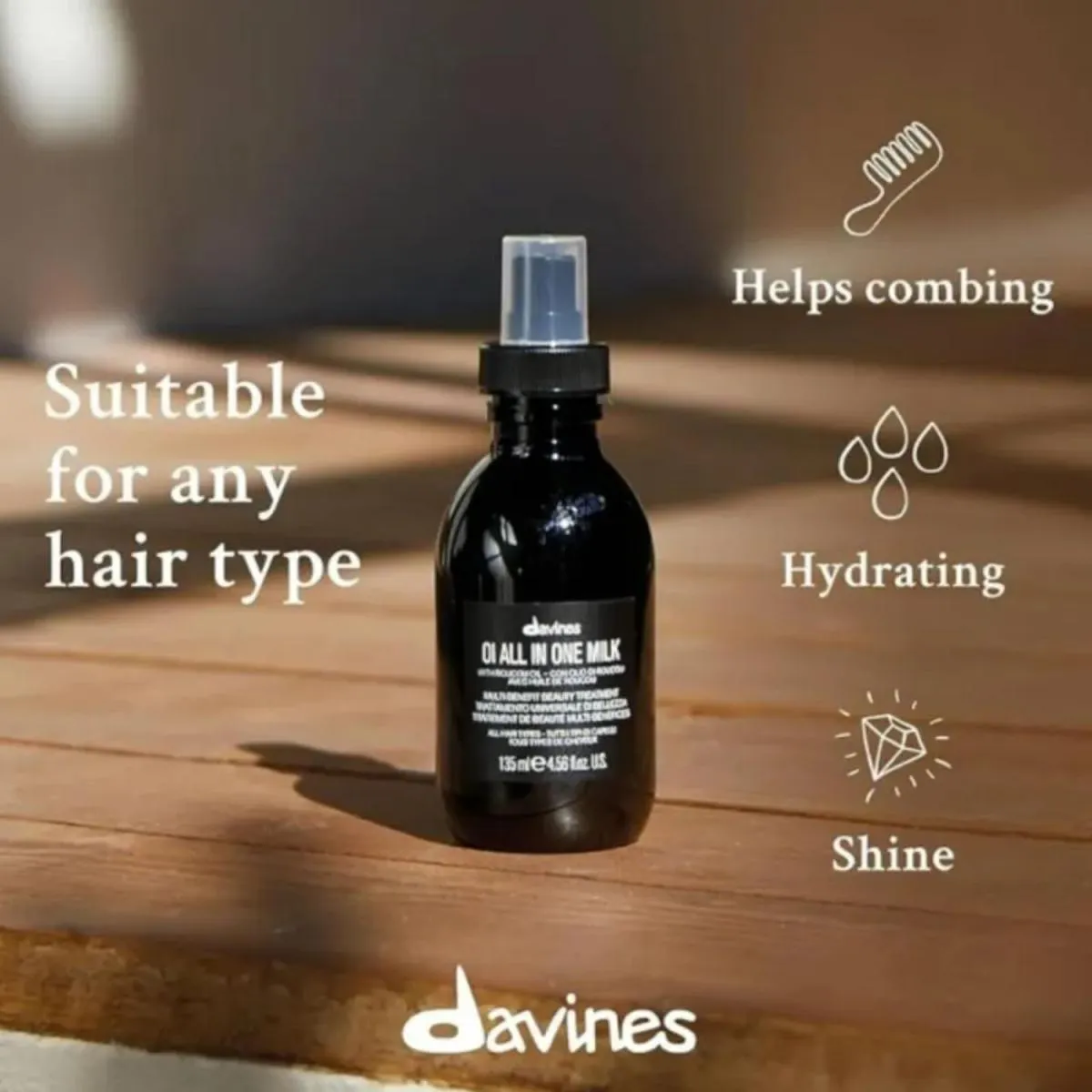 O Leave-in Multibenefícios Davines OI All In One de 135 ml, promove uma infinidade de benefícios. Sua fórmula leve possui Provitamina B5 e um complexo de aminoácidos que hidratam profundamente o cabelo proporcionando brilho, suavidade e sedosidade aos fios. Possui ação antifrizz e excelente poder desembaraçante, além de dar corpo sem pesar os cabelos. Leave-in para todos os tipos de cabelo. Pertence a linha OI, best-seller e queridinha de Davines, dedicada à beleza absoluta dos fios. Tudo que você precisa em um único Leave-in, a praticidade de um spray com os benefícios de um creme.Benefícios: