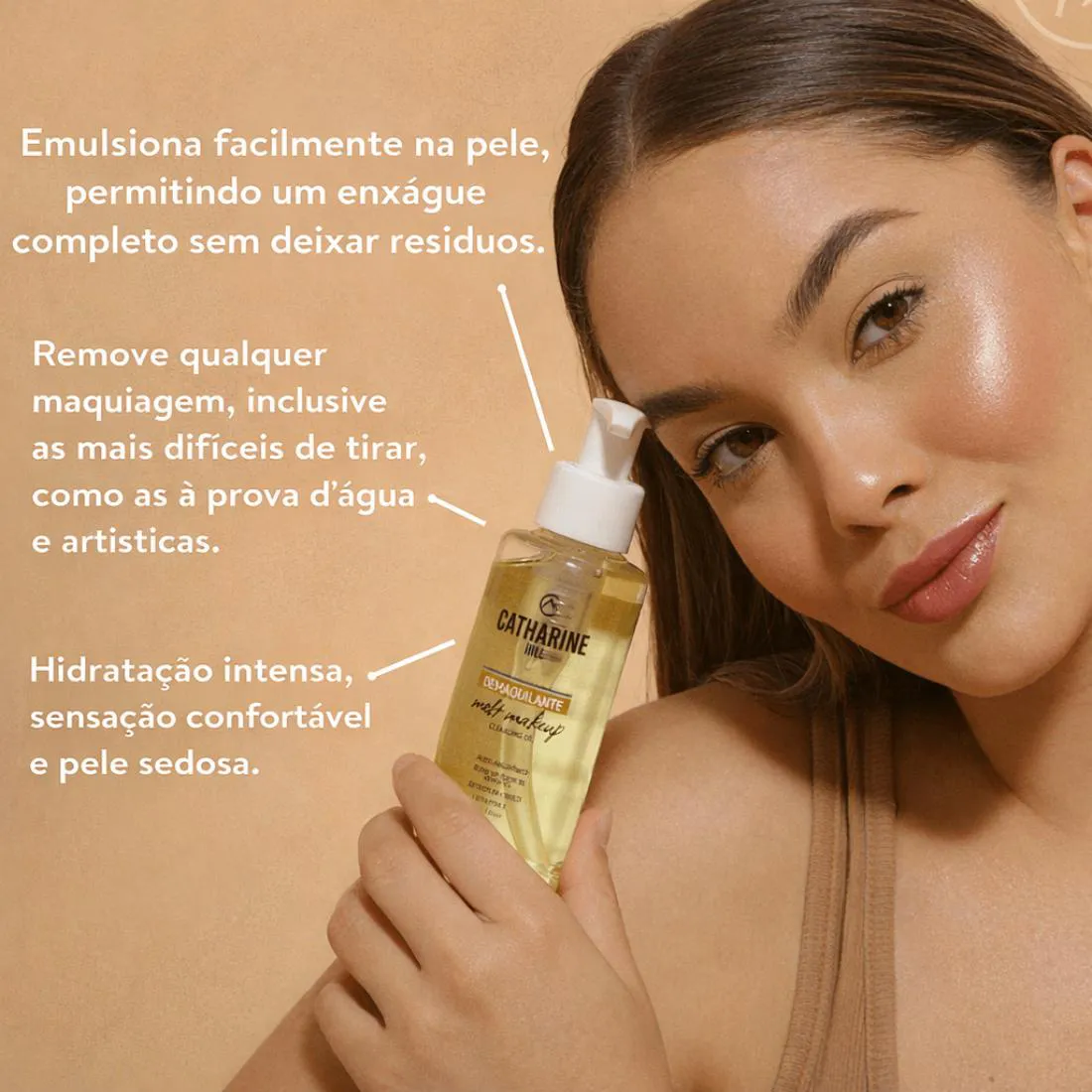 Conheça um pouco mais! O Demaquilante Melt Makeup Cleansing Oil da Catharine Hill foi desenvolvido para remover qualquer tipo de maquiagem, inclusive as mais difíceis, como produtos à prova d’água e maquiagem artística. Sua textura em óleo (Cleansing Oil) se transforma em uma emulsão suave ao entrar em contato com a água, proporcionando limpeza profunda sem deixar a pele oleosa ou pegajosa. Sua fórmula contém blend de óleos vegetais, ácido hialurônico e extrato de hibisco, ativos que auxiliam na hidratação e ajudam a manter a sensação de conforto após a remoção da maquiagem. É indicado para todos os tipos de pele e pode ser utilizado como primeiro passo da dupla limpeza na rotina de skincare. Ideal para quem busca praticidade, eficiência e cuidado ao remover a maquiagem no dia a dia. Contém: 110ml Você vai amar! A textura leve desliza facilmente sobre a pele seca e “derrete” a maquiagem sem esforço. Ao adicionar água, o óleo emulsiona rapidamente, facilitando o enxágue e deixando a pele limpa, macia e com toque sedoso. Não repuxa, não arde e não deixa sensação pesada. É aquela limpeza eficiente com sensação confortável que transforma sua rotina noturna. Pega essas dicas! Aplique de 1 a 2 pumps na pele seca e massageie suavemente até dissolver completamente a maquiagem. Após massagear, adicione um pouco de água para emulsificar e enxágue normalmente. Utilize como primeiro passo da dupla limpeza, especialmente se usar protetor solar ou maquiagem pesada. Pode ser usado diariamente, principalmente à noite. Não é necessário usar algodão, o que evita desperdício e atrito excessivo na pele.