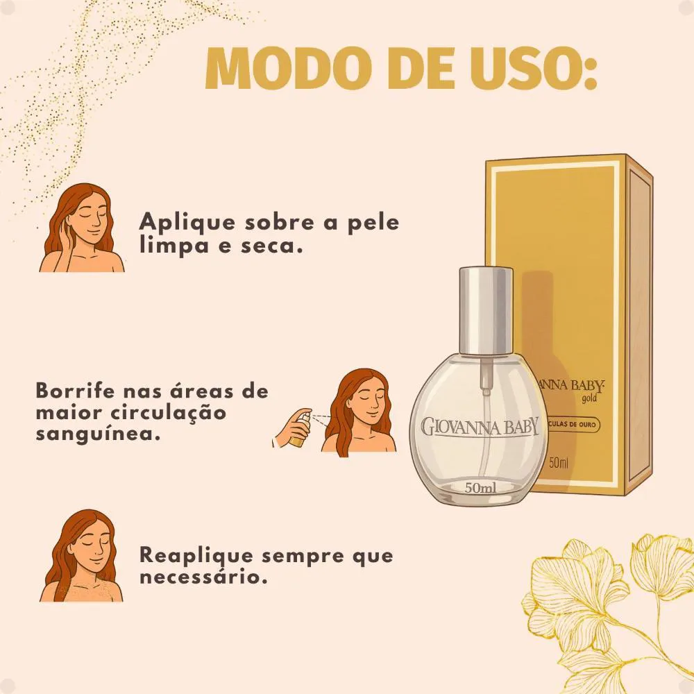 Aplique a Deo Colônia Giovanna Baby Gold sobre a pele limpa e seca, preferencialmente nas áreas de maior circulação sanguínea, como pulsos, pescoço e atrás das orelhas, para prolongar a fixação da fragrância. . Código de Registro Sanitário (ANVISA) 25351.528284/2022-69