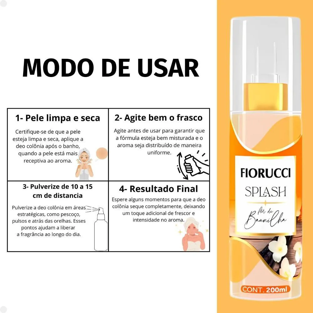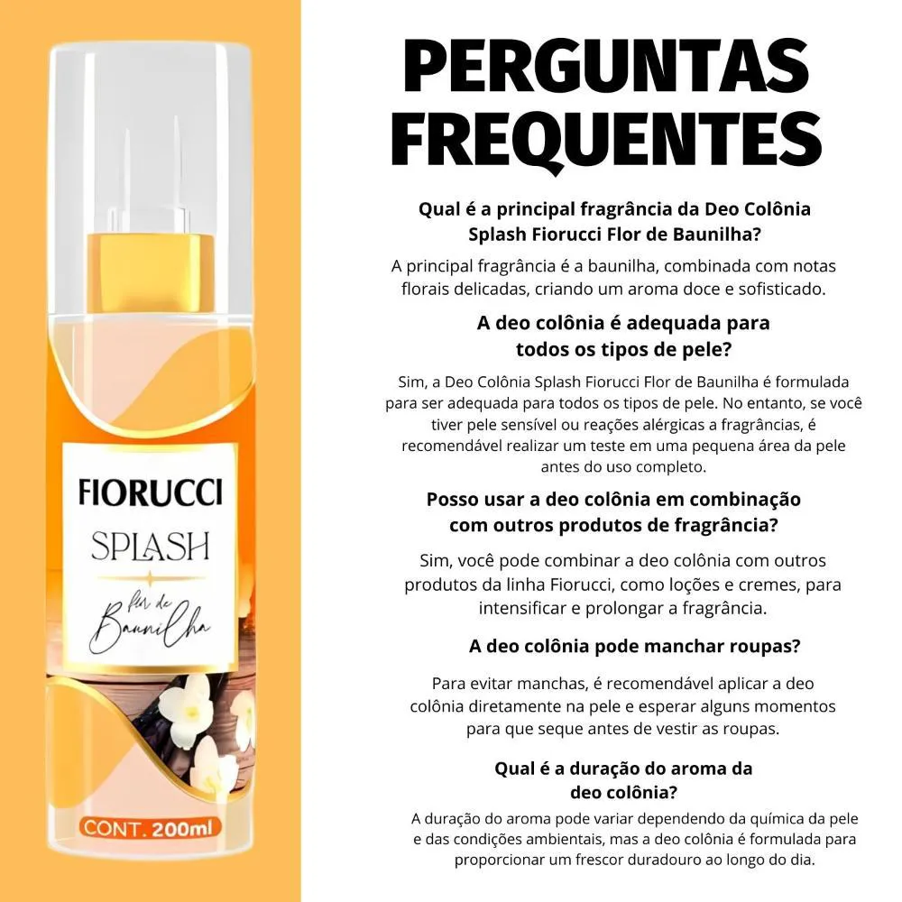 Deo Colônia Flor de Baunilha Experimente o charme irresistível da Deo Colônia Splash Fiorucci Flor de Baunilha. Esta fragrância sofisticada celebra a doçura envolvente da baunilha, combinando notas florais delicadas para criar um aroma encantador e aconchegante. Ideal para quem busca uma sensação de frescor suave e uma presença marcante, esta deo colônia é a escolha perfeita para realçar sua beleza e estilo. Família olfativa: Oriental Gourmand Pirâmide Olfativa: Saída: Laranja, Limão Siciliano e Maçã corpo: Flor de Jasmim, Muguet e Baunilha Fundo: Âmbar, Musk e Caramelo . Modo de Uso Aplique a Deo Colônia Splash Flor de Baunilha sobre a pele limpa e seca, preferencialmente após o banho. Reaplique sempre que desejar um toque de frescor. . Composição Álcool, água desmineralizada, fenoxietanol, benzofenona, bht, fragrancia, álcool benzilico, limoneno, linalol, ci 19140 corante amarelo ci 19140, ci 14700 corante vermelho ci 14700, ci 42090 corante azul ci 42090. . Perguntas Frequentes Qual é a principal fragrância da Deo Colônia Splash Fiorucci Flor de Baunilha? A principal fragrância é a baunilha, combinada com notas florais delicadas, criando um aroma doce e sofisticado. A deo colônia é adequada para todos os tipos de pele? Sim, a Deo Colônia Splash Fiorucci Flor de Baunilha é formulada para ser adequada para todos os tipos de pele. No entanto, se você tiver pele sensível ou reações alérgicas a fragrâncias, é recomendável realizar um teste em uma pequena área da pele antes do uso completo. Posso usar a deo colônia em combinação com outros produtos de fragrância? Sim, você pode combinar a deo colônia com outros produtos da linha Fiorucci, como loções e cremes, para intensificar e prolongar a fragrância. A deo colônia pode manchar roupas? Para evitar manchas, é recomendável aplicar a deo colônia diretamente na pele e esperar alguns momentos para que seque antes de vestir as roupas. Qual é a duração do aroma da deo colônia? A duração do aroma pode variar dependendo da química da pele e das condições ambientais, mas a deo colônia é formulada para proporcionar um frescor duradouro ao longo do dia. . Código de Registro Sanitário (ANVISA) 25351.105669/2024-13