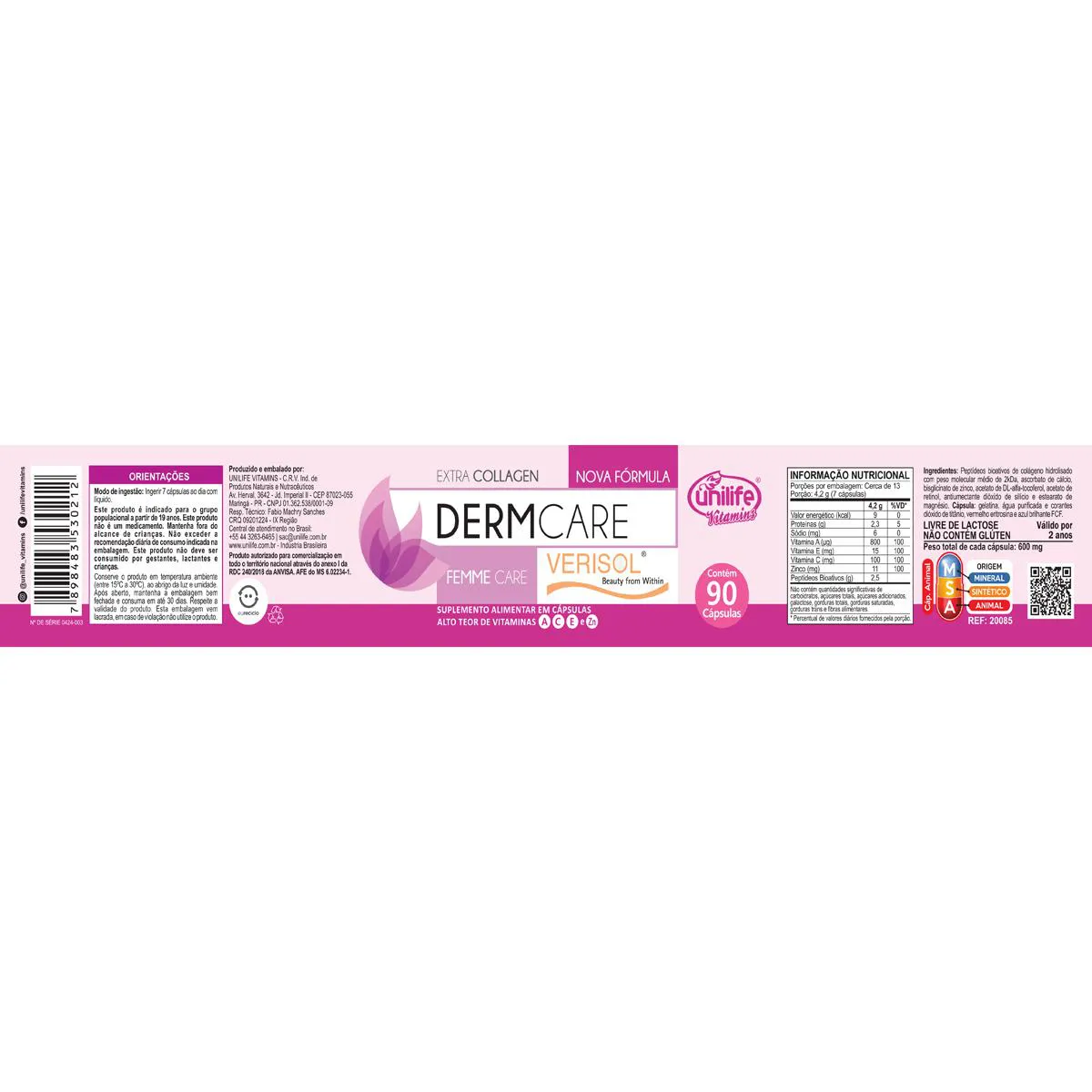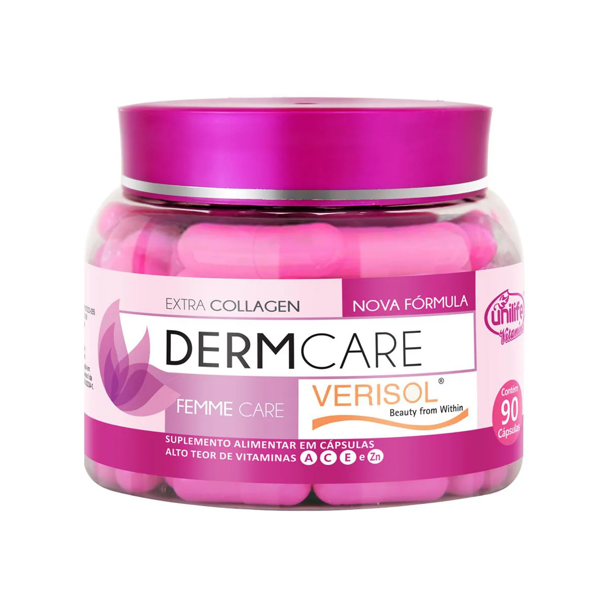 Derm Care Verisol Unilife 90 Cápsulas é um suplemento à base de peptídeos bioativos de colágeno verisol, que combatem o envelhecimento precoce da pele, fortalece cabelos e unhas. A deficiência de colágeno diminui a elasticidade da pele e colabora com o envelhecimento da pele. A reposição de colágeno é importante a partir dos 30 anos e essencial depois dos 50. Benefícios e Diferenciais: - Regeneração dos tecidos do organismo