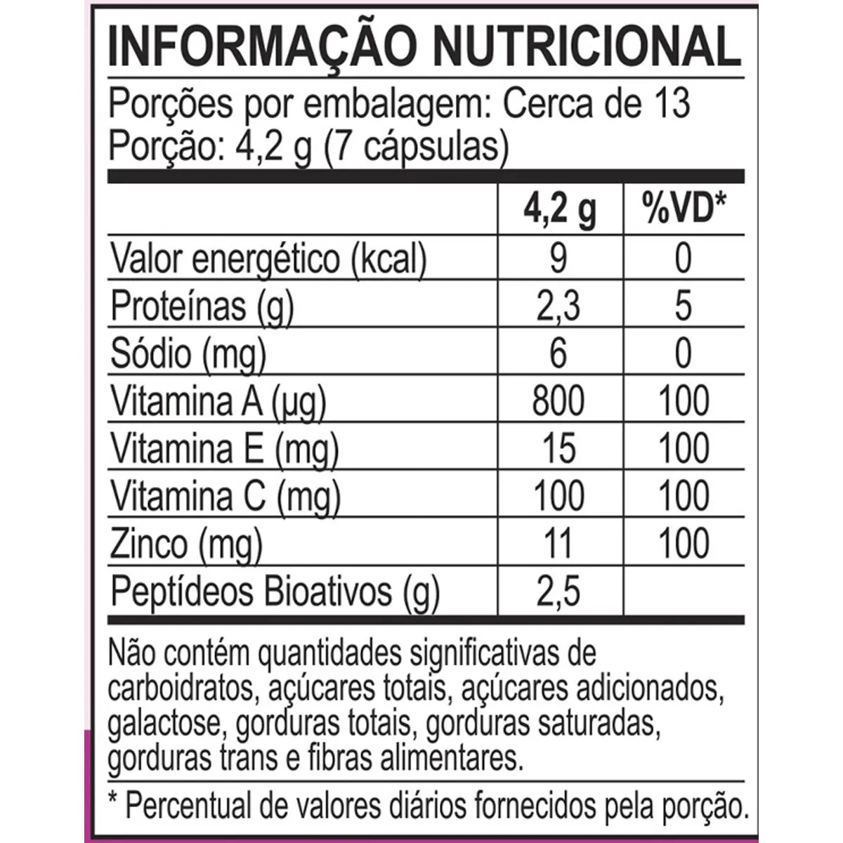 Informações Complementares Atua em conjunto das vitaminas A, E, C e Zinco, substâncias especiais no desenvolvimento e regeneração dos tecidos do organismo.O Colágeno Verisol é especialmente desenvolvido para a manutenção da beleza da pele. Ingredientes Colágeno bovino hidrolisado verisol, ácido ascórbico (vitamina c), bisglicinato de zinco, acetato de tocoferol e acetato de retinol. Cápsula: gelatina bovina, água, corantes: dióxido de titânio, vermelho eritrosona e azul brilhante. Modo de Uso Ingerir 5 cápsulas ao dia após das principais refeições. Produto enviado com Validade Apta para o Consumo.