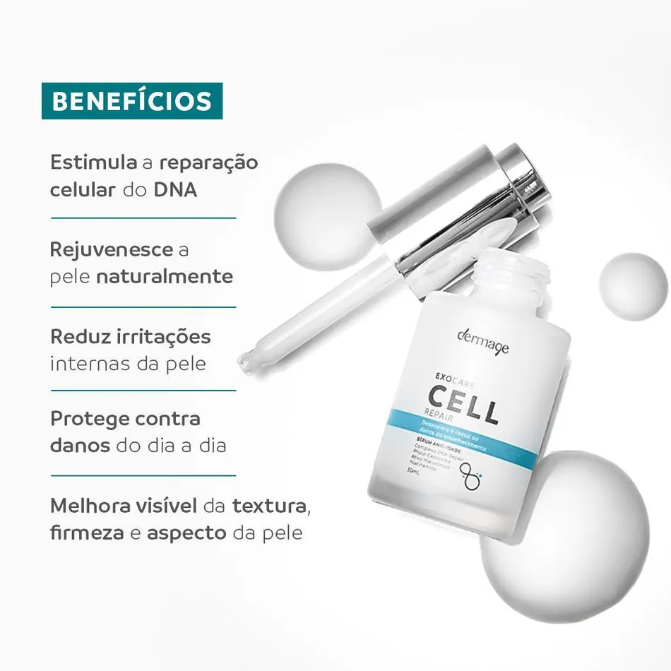 O Exocare Cell Repair é um sérum anti-idade revolucionário com tecnologia exclusiva de reparação do DNA celular. Desenvolvido para uso diário em peles que necessitam de procedimentos estéticos, recuperando e fortalecendo efetivamente a barreira cutânea. Seu tratamento avançado regenera, recupera e protege a estrutura do DNA celular.Este produto é indicado para todas as pessoas que buscam: tratamento anti-idade avançado; Reparação de danos causados pela radiação UV; Prevenção do envelhecimento precoce; Regeneração celular profunda; Fortalecimento da barreira cutânea; Indicado inclusive para quem já teve carcinoma.