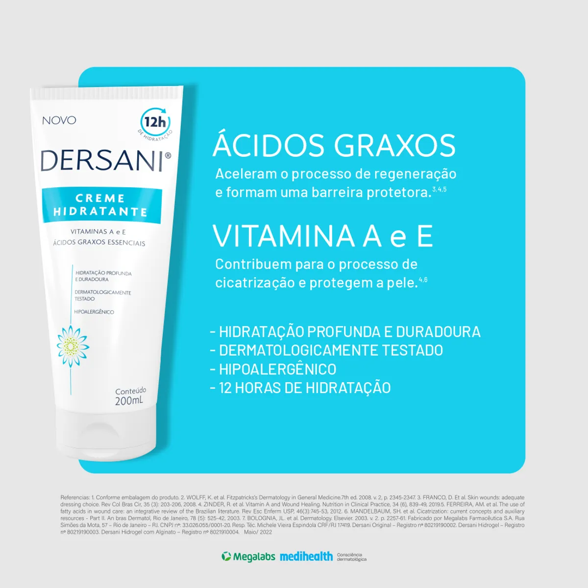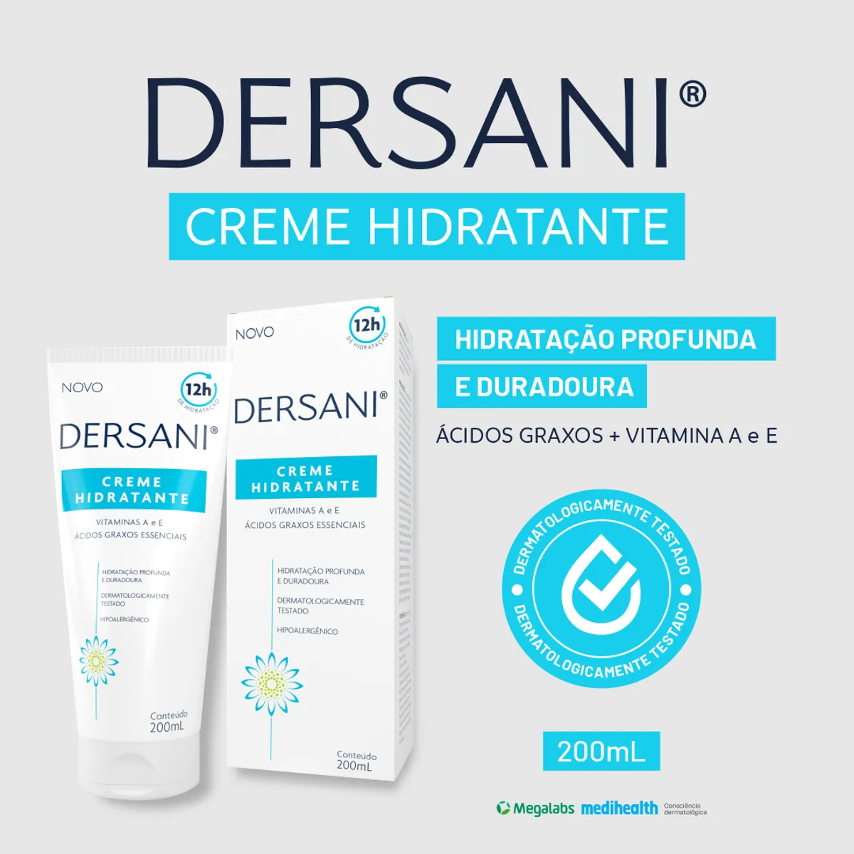 Dersani contém lipídios idênticos aos da pele e alta concentração de agentes umectantes que permitem uma hidratação eficaz e o restabelecimento do equilíbrio natural da pele e fórmula com Vitaminas A e E e Ácidos graxos essenciais.