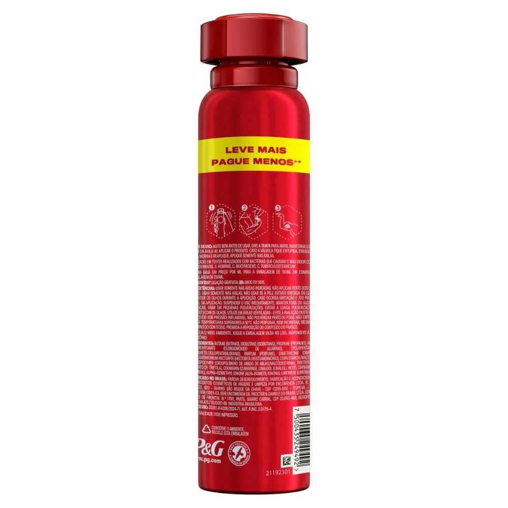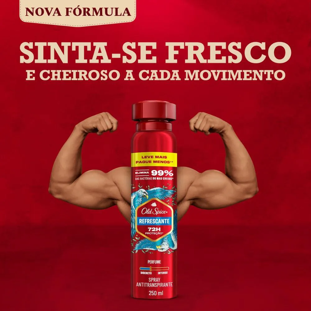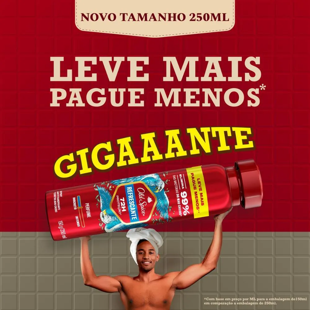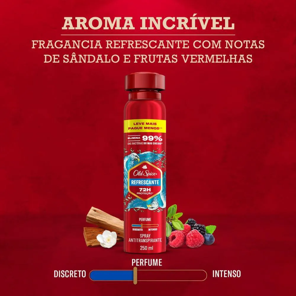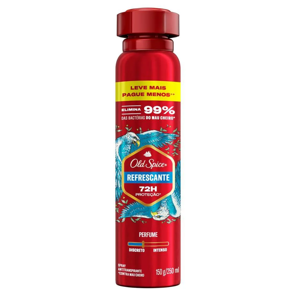 Novo Old Spice 250ml. Leve mais, pague menos*.Experimente mais poder e estilo com o desodorante antitranspirante em spray Old Spice Refrescante! Sinta-se protegido contra o suor e o mau cheiro e enfrente seus desafios com mais confiança, graças ao aroma inesquecível que combina notas de sândalo e frutas vermelhas.*Com base em preço por ML para a embalagem de 150ml em comparação a embalagem de 250ml.