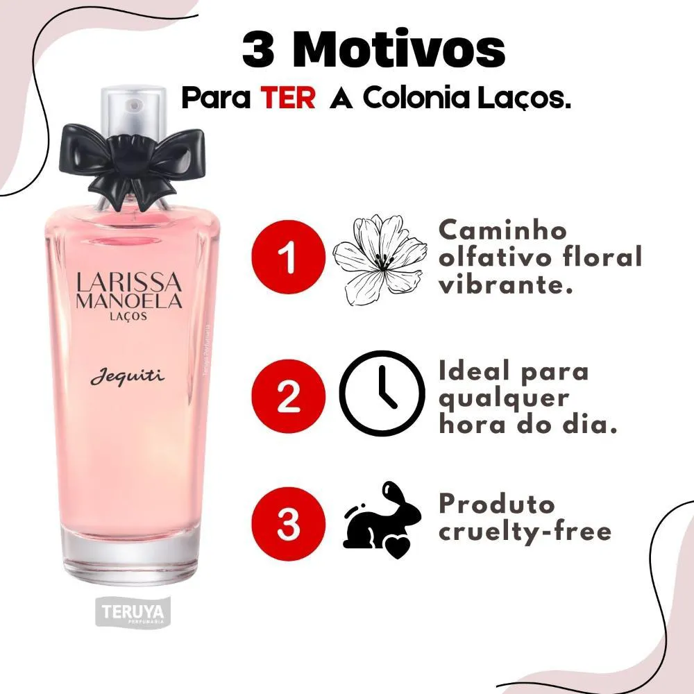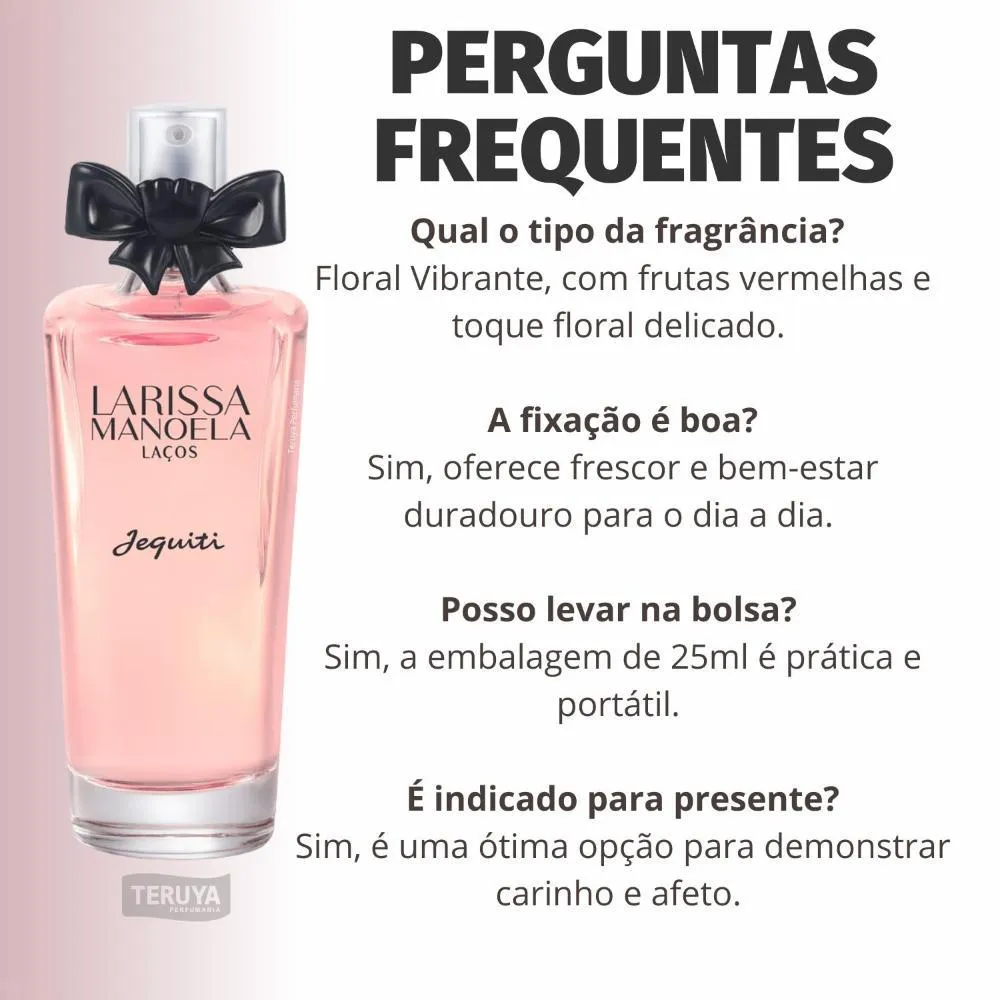 Nome do Produto: Desodorante Colônia Feminina Jequiti Larissa Manoela Laços 25mlMarca: JEQUITIVolume: 25mlCaminho Olfativo: Floral VibranteGênero: FemininoCruelty-Free: SimDermatologicamente Testado: SimConcentração da Fragrância: Desodorante Colônia Anvisa:25351.720111/2023-81