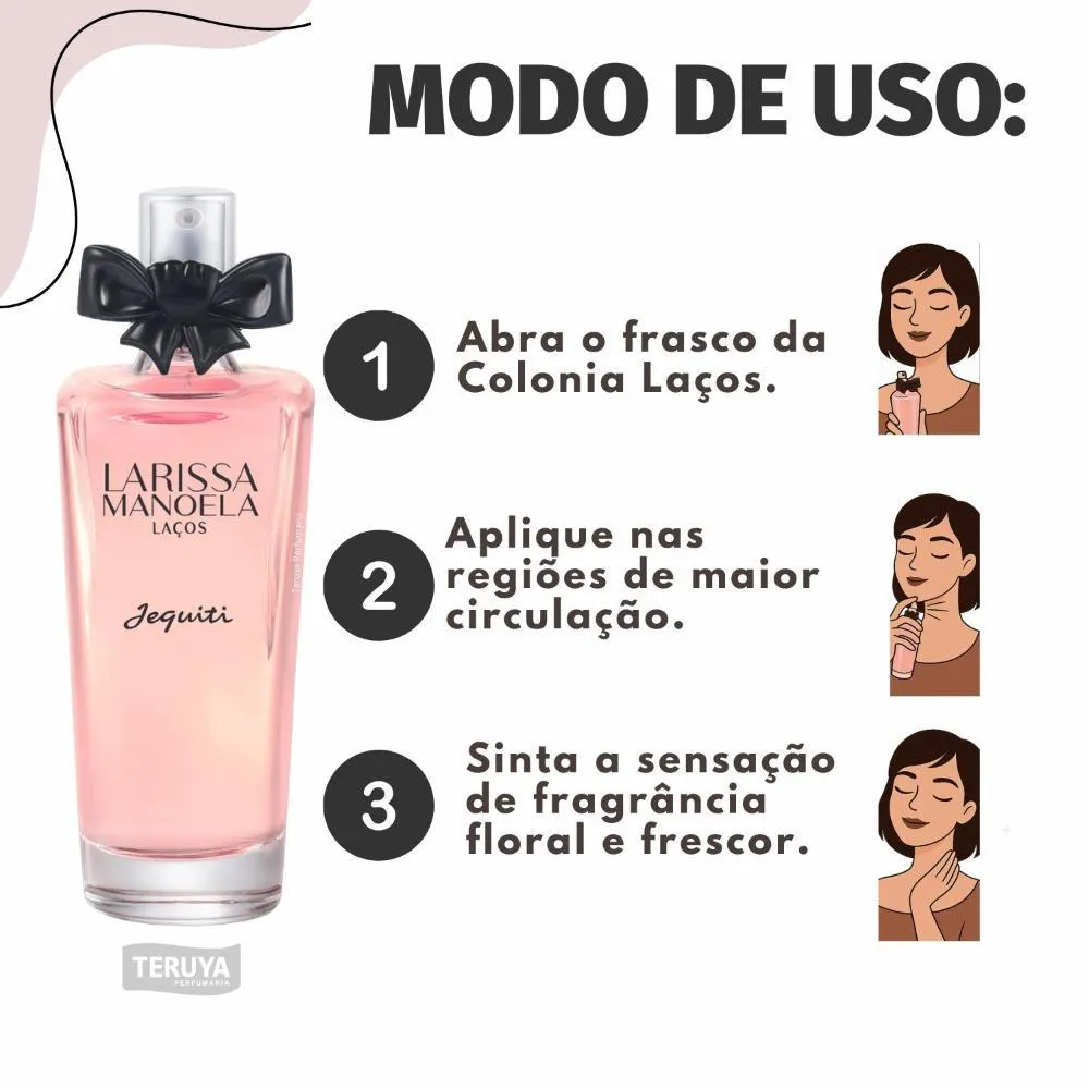Aplique o Desodorante Colônia Feminina Jequiti Larissa Manoela Laços 25ml nas regiões de maior circulação, como pulsos, pescoço e atrás das orelhas, ou onde preferir.Para uma melhor fixação e projeção da fragrância, hidrate a pele antes da aplicação.Pode ser usado a qualquer hora do dia e da noite para uma perfumação duradoura e envolvente.