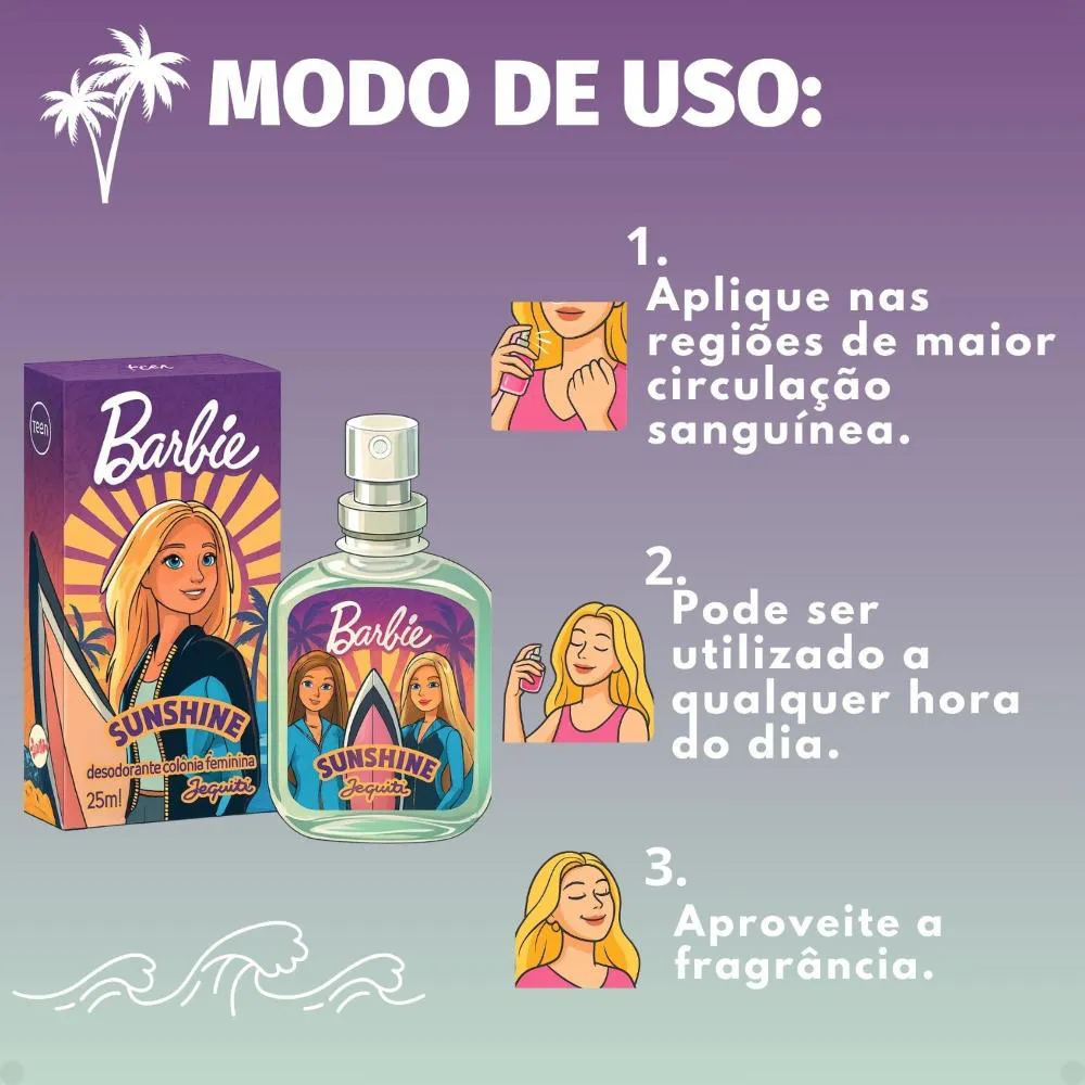 Aplique o Desodorante Colônia Jequiti Teen Barbie Sunshine sobre a pele, preferencialmente nos pulsos, pescoço e atrás das orelhas. Para uma melhor fixação e prolongamento da fragrância, aplique logo após o banho, com a pele ainda levemente úmida. Evite esfregar o produto após a aplicação.
