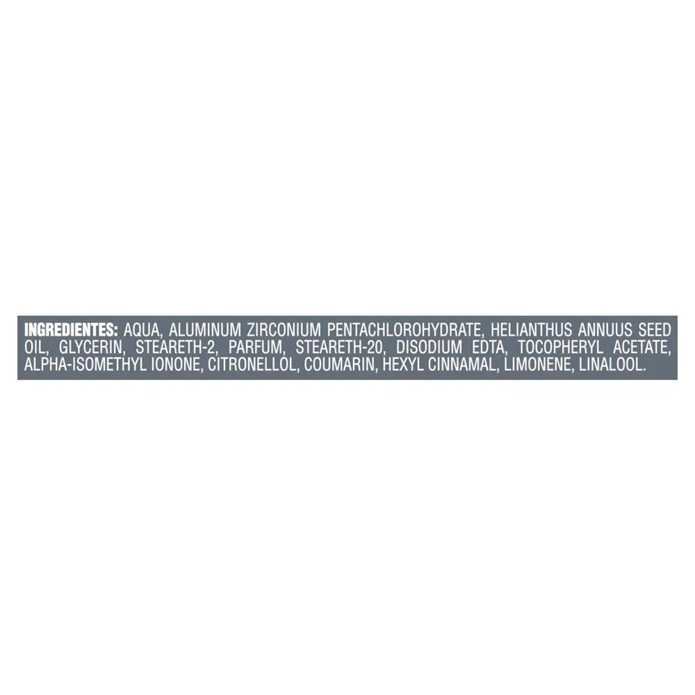 Aqua, aluminum zirconium pentachlorohydrate, helianthus annuus seed oil, glycerin, steareth-2, parfum, steareth-20, disodium EDTA, tocopheryl acetate, alpha-isomethyl ionone, citronellol, coumarin, hexyl cinnamal, limonene, linalool.