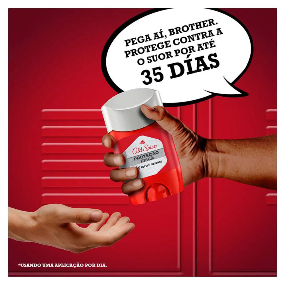 Experimente o novo Old Spice Proteção Épica em barra com tecnologia 4X Active Defense+, que oferece proteção extra e poderosa contra o suor e mau cheiro, fragrância duradoura durante todo o dia por até 48 horas e contém partículas emolientes para a pele.