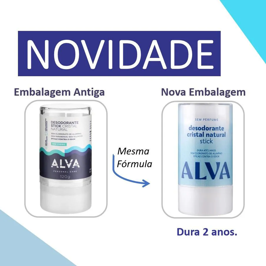 O desodorante da Alva é em forma de cristal que pode durar até 2 anos usando todos os dias. É translúcido, cristalino, inodoro e incolor e não mancha as roupas.