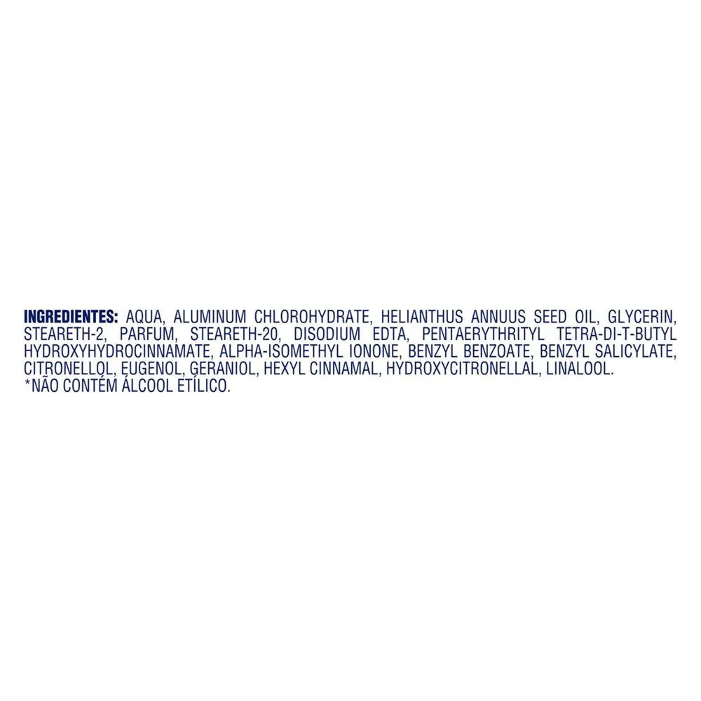 Aqua, aluminum chlorohydrate, helianthus annuus seed oil, glycerin, steareth-2, parfum, steareth-20, disodium EDTA, pentaerythrityl tetra-di-t-butyl hydroxyhydrocinnamate, alpha-isomethyl ionone, benzyl benzoate, benzyl salicylate, citronellol, eugenol, geraniol, hexyl cinnamal, hydroxycitronellal, linalool.