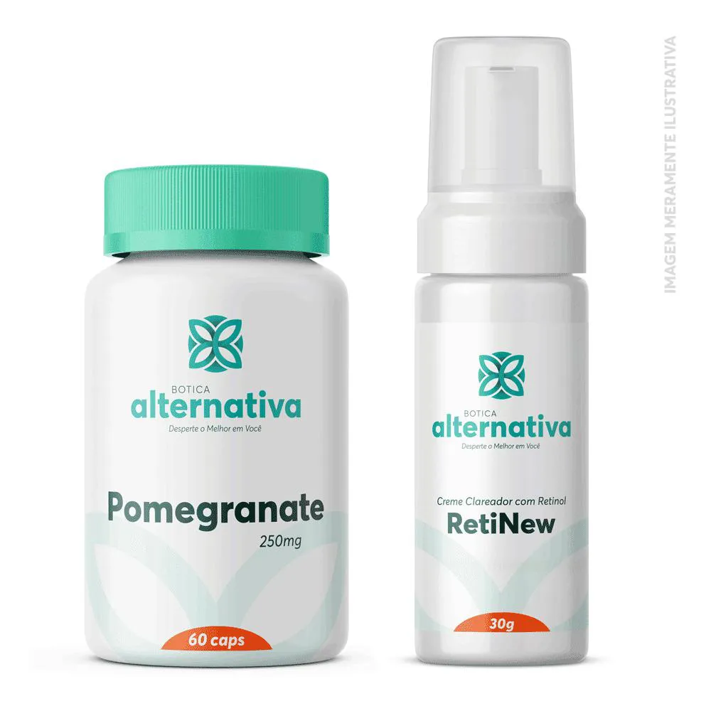 O Kit Manchas IN/OUT é um tratamento dermocosmetico inovador composto por um creme clareador e cápsulas nutritivas de Pomegranate, desenvolvido para clarear manchas e melasmas na pele. O kit atua simultaneamente de fora para dentro, combinando produtos tópicos e suplementação para uniformizar o tom da pele.