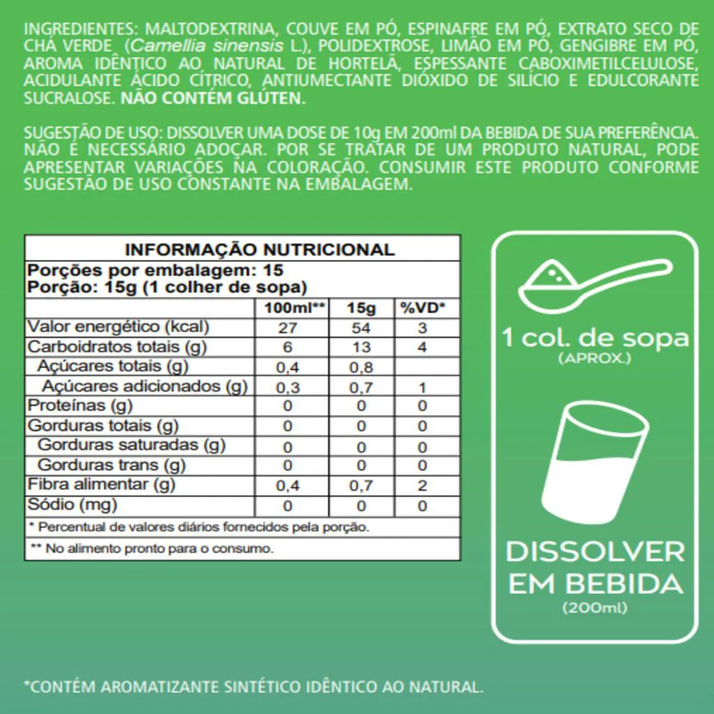 Composição: Maltodextrina, couve em pó, espinafre em pó, extrato seco de chá verde (Camellia sinensis L), polidextrose, limão em pó, gengibre em pó, aroma idêntico ao natural de hortelã, espessante carboximetilcelulose, acidulante ácido cítrico, antiumectante dióxido de silício e edulcorante sucralose.