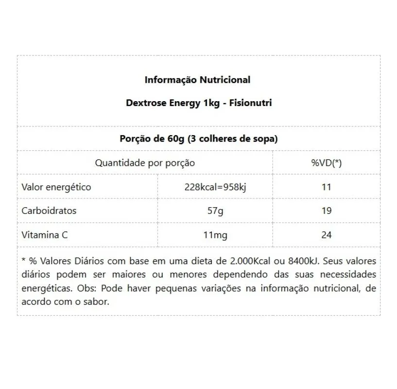 Dextrose Energy (1kg) Dextrose Energy é formulado com dextrose, um carboidrato simples derivado da conversão enzimática do amido de milho, de rápida absorção, fornecendo energia imediata para melhorar a disposição e o desempenho durante o treino, além de promover a recuperação pós treino. Por conter carboidratos simples em sua composição, é de considerável importância para praticantes de exercício físico, visto que os carboidratos têm como principal função prover energia para o organismo e, dessa maneira, prevenir situações de fadiga, câimbras e queimação muscular. Benefícios: - Eleva os níveis de energia no corpo;- Retarda os efeitos da fadiga;- Aumento glicogênio muscular;- Melhor desempenho físico;- Auxílio no processo de recuperação muscular.