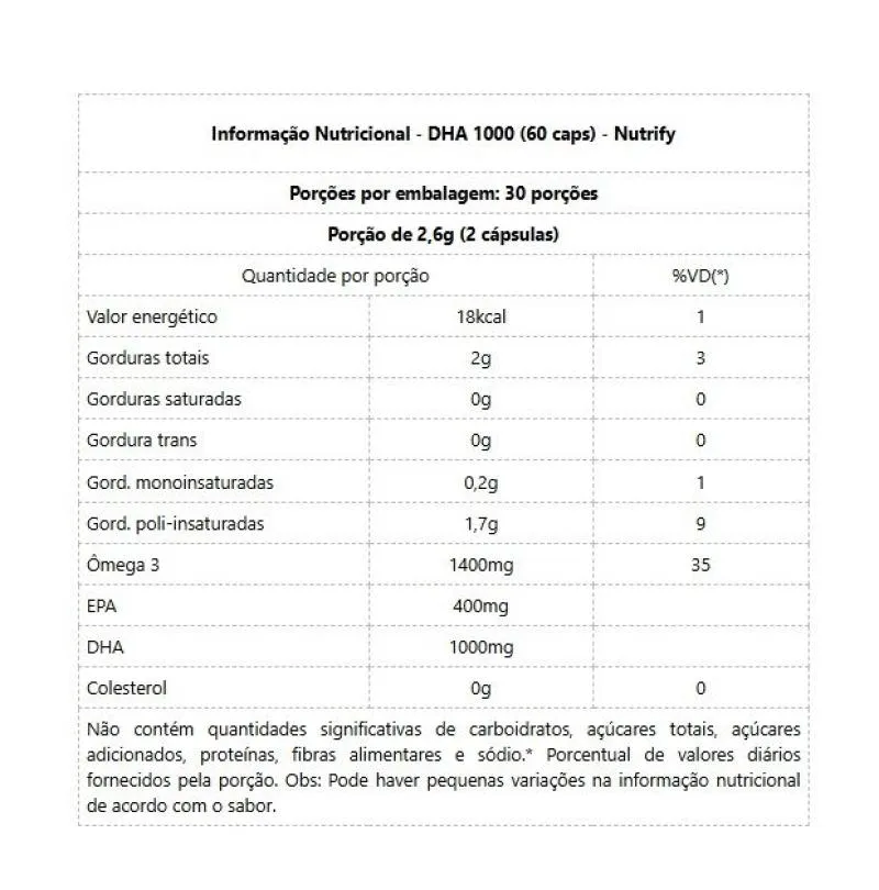 DHA 1000 (60 caps) Entre alta concentração e fonte sustentável, fique com os dois. Os benefícios da suplementação de ômega 3 são amplamente respaldados pela ciência. DHA 1000 NUTRIFY é ultra concentrado em DHA, o ácido graxo predominante no cérebro. O óleo de peixe utilizado em sua produção é o MEG-3®, originado de pescas regulamentadas que protegem as reservas naturais, garantindo alta qualidade, concentração, pureza e sustentabilidade. Além da tecnologia inovadora de microencapsulação do MEG-3® que reduz significativamente o retrogosto de peixe que algumas pessoas sentem ao suplementar ômega 3. Mais conforto e segurança para você. Benefícios: - 400mg de EPA;- 1000mg de DHA;- 1400mg de omega 3 por porção.- Zero Lactose e Zero Glúten;- Não Transgênico.