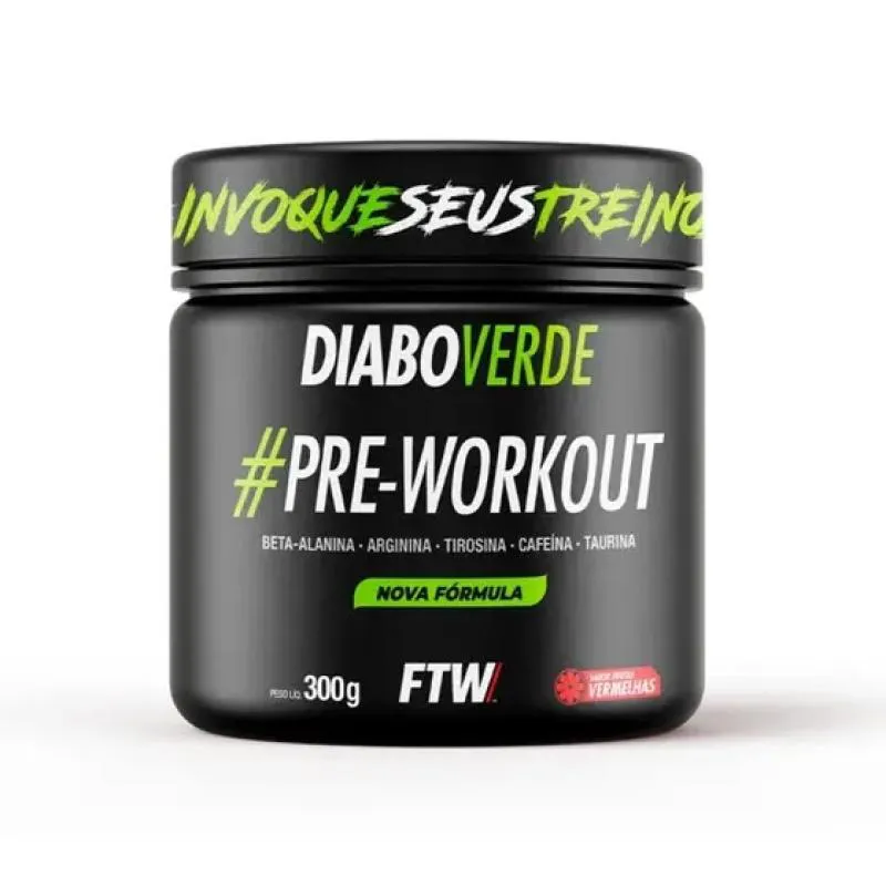 Diabo Verde Insano Pre-Workout (300g) - FTW Sports NutritonSeu treino muito mais insano! Deixe seu treino insano com um poderoso pré-workout com 200mg de cafeína. Em sua composição encontramos aminoácidos não essenciais como a alanina, a arginina e a taurina. Além de sua base, duas substâncias potentes: a cafeína, que auxilia no aumento da performance no desempenho de exercícios físicos de resistência. Compre com garantia de qualidade direto da fábrica. O que é o Diabo Verde Insano FTW? Cada substância escolhida para o Diabo Verde Insano FTW, foi pensada exclusivamente para o melhor desempenho das vias metabólicas do nosso organismo. Diabo Verde Insano FTW é a combinação perfeita para o seu treino!Como tomar o Diabo Verde Insano FTW? A melhor maneira de como consumir o Diabo Verde Insano FTW dependerá de cada caso. Por isso, é necessário consultar um profissional da saúde para acrescentar esse produto em sua rotina. Dessa forma irá depender da demanda do organismo de cada um. De qualquer forma em nossa embalagem recomendamos diluir 10g (2 medidas dosadoras) em 1 copo contendo 200ml de água gelada ou suco de preferência. Benefícios:* Força e Disposição para treinos mais duradouros;* Maior vasodilatação dos vasos sanguíneos; * Acelera o crescimento muscular;* Aumento prolongado da energia;