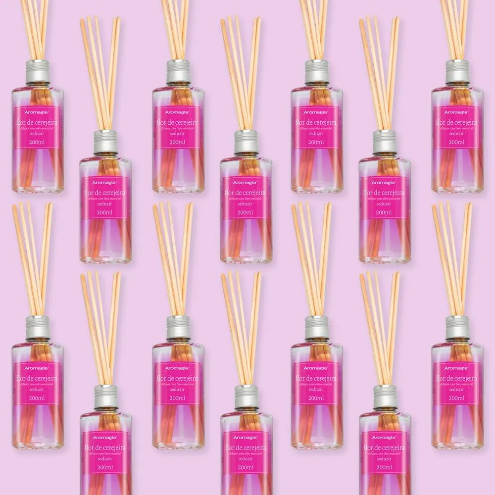 Odorizante de ambiente AROMA STICKS Flor de Cerejeira. Aromatização continua para ambientes através da imersão de varetas de madeira. Desperta sensação de sedução e amorosidade. Contém fração de óleo essencial de Ylang-Ylang, proporcionando uma experiência olfativa bastante harmônica. Sem corante. Vegano. Não testado em animais. Aroma floral e adocicado. Proporciona bem-estar por meio da perfumação continua. Não possui efeito terapêutico.