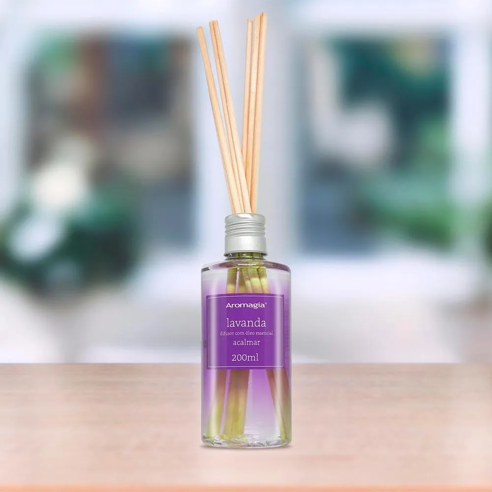 Odorizante de ambiente AROMA STICKS Lavanda. Aromatização continua para ambientes através da imersão de varetas de madeira. Desperta sensação de calma, tranquilidade e paz. Contém fração de óleo essencial natural de Lavanda, proporcionando uma experiência olfativa bastante harmônica. Sem corante. Vegano. Não testado em animais. Aroma floral e levemente adocicado. Proporciona bem-estar por meio da perfumação continua. Não possui efeito terapêutico.