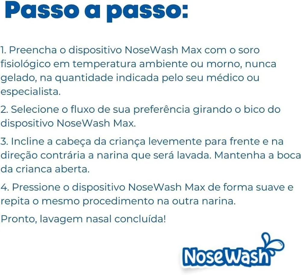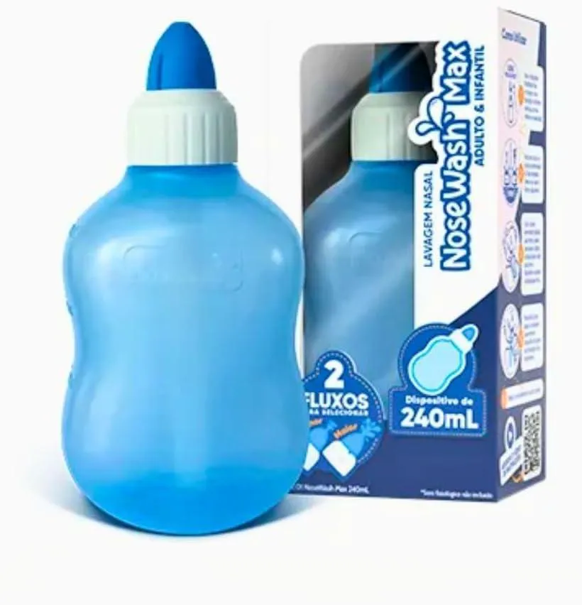 Dispositivo para Lavagem Nasal Nosewash Max - Adulto/infantil - 240mlO Nosewash Max é o primeiro dispositivo de alto volume (240mL) com controle de fluxo, assim você poderá escolher maior ou menor intensidade e com bico super confort para dar ainda mais conforto durante a lavagem nasal.