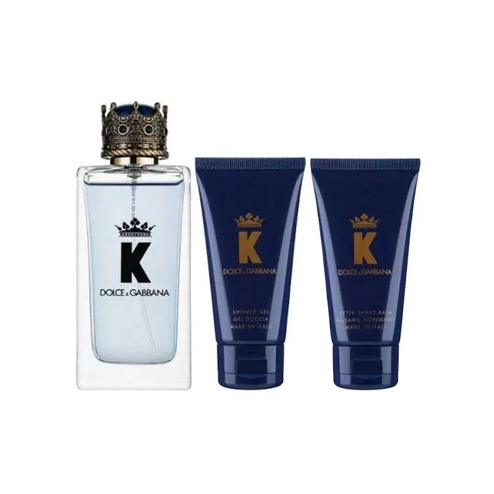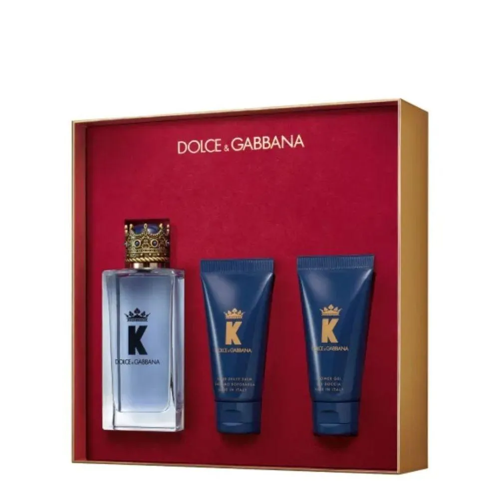 O kit é um conjunto de produtos de cuidados pessoais e fragrância masculina, composto por Eau de Toilette, After Shave Balm e Shower Gel, todos da linha Dolce & Gabbana K.