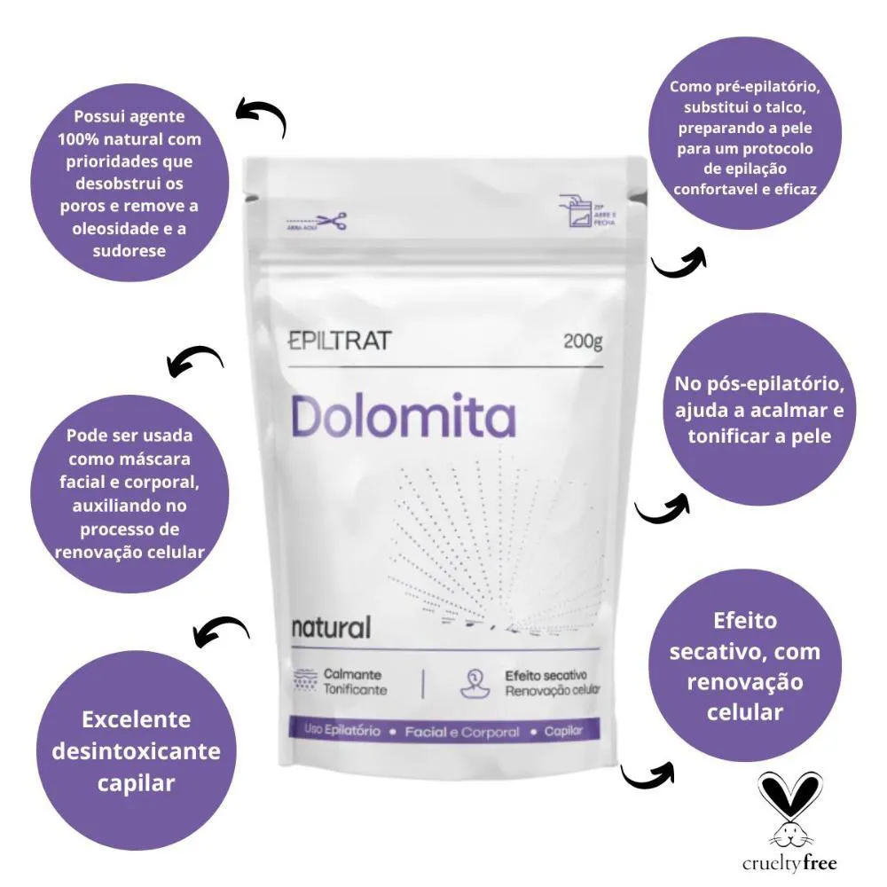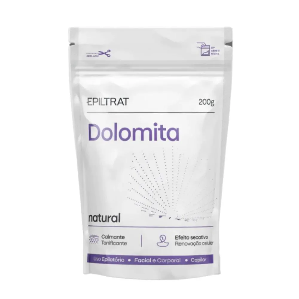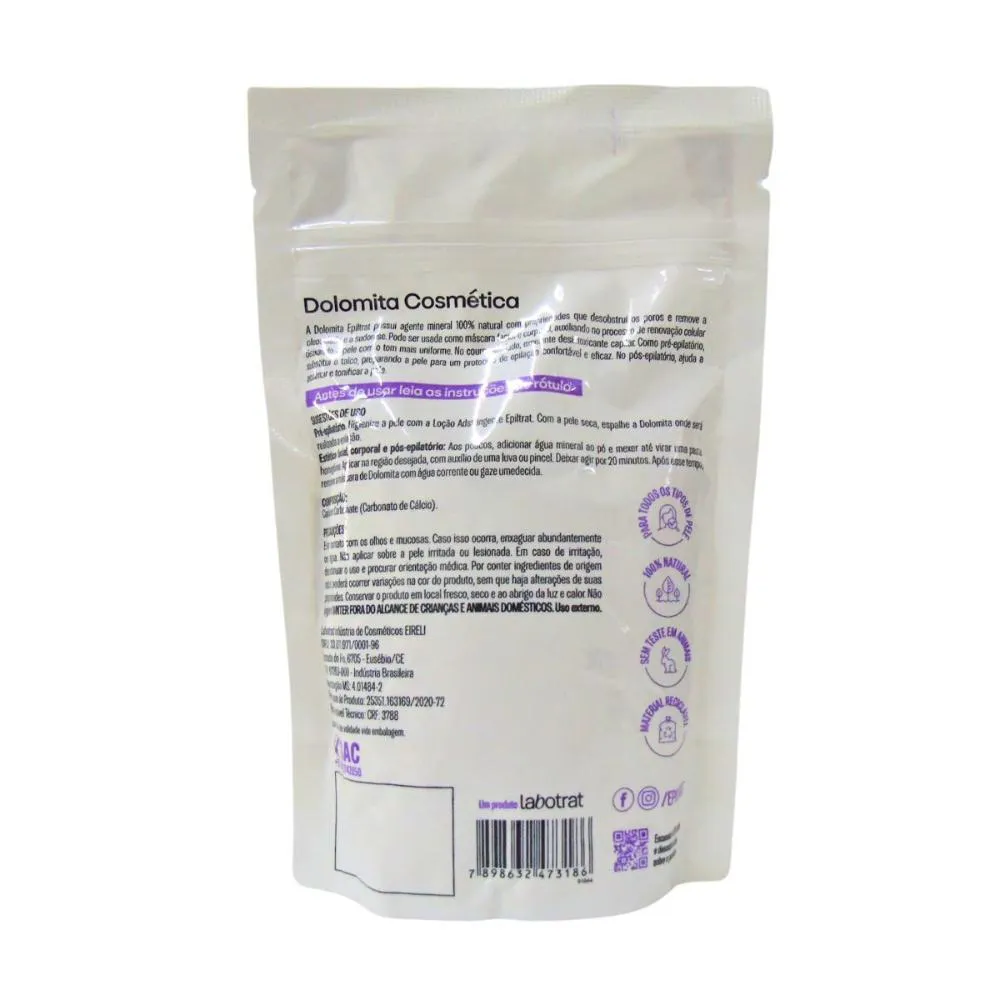Dolomita Cosmética Natural A Dolamita Epiltrat possui agente 100% natural com prioridades que desobstruiu os poros e remove a oleosidade e a sudorese. Pode ser usada como máscara facial e corporal, auxiliando no processo de renovação celular deixando a pele com o tom mais uniforme. No couro cabeludo, excelente desintoxicante capilar. Como pré-epilatório, substitui o talco, preparando a pele para um protocolo de epilação confortavel e eficaz. No pós-epilatório, ajuda a acalmar e tonificar a pele. . Modo de Uso Pré-epilatório Higienize a pele com a loção adstringente epiltrat. Com a pele seca, espalhe a Dolomita onde sera realizado a epilação. Estética facial, corporal e pós-epilatorio Aos poucos, adicionar água mineral ao pó e mexer até virar uma pasta homogênea. Aplicar na região desejada, com auxilio de uma luva ou pincel. Deixar agir por 20 minutos. Após esse tempo, remover a máscara de Dolomita com água corrente ou gaze umedecida. . Composição Calcium Carbonate (carbonato de cálcio).