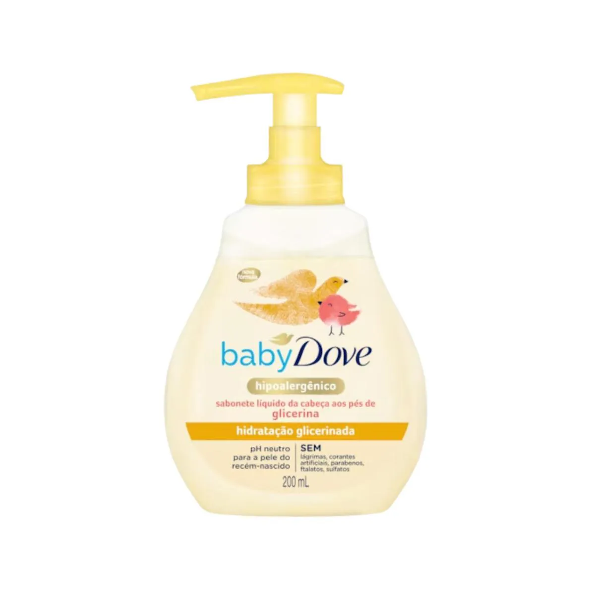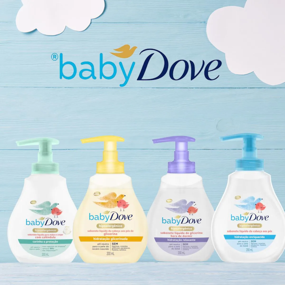 O Dove Baby Sabonete Líquido é um produto hipoalergênico desenvolvido especificamente para bebês, formulado com glicerina e nutrientes naturais. Serve para realizar a limpeza suave da pele do bebê desde o primeiro banho, proporcionando hidratação e reposição de nutrientes essenciais, com cuidado especial para a pele delicada dos recém-nascidos. Possui pH neutro, não contém lágrimas, corantes artificiais, parabenos, ftalatos ou sulfatos, sendo testado por oftalmologista, dermatologista e pediatra para minimizar riscos de alergia.