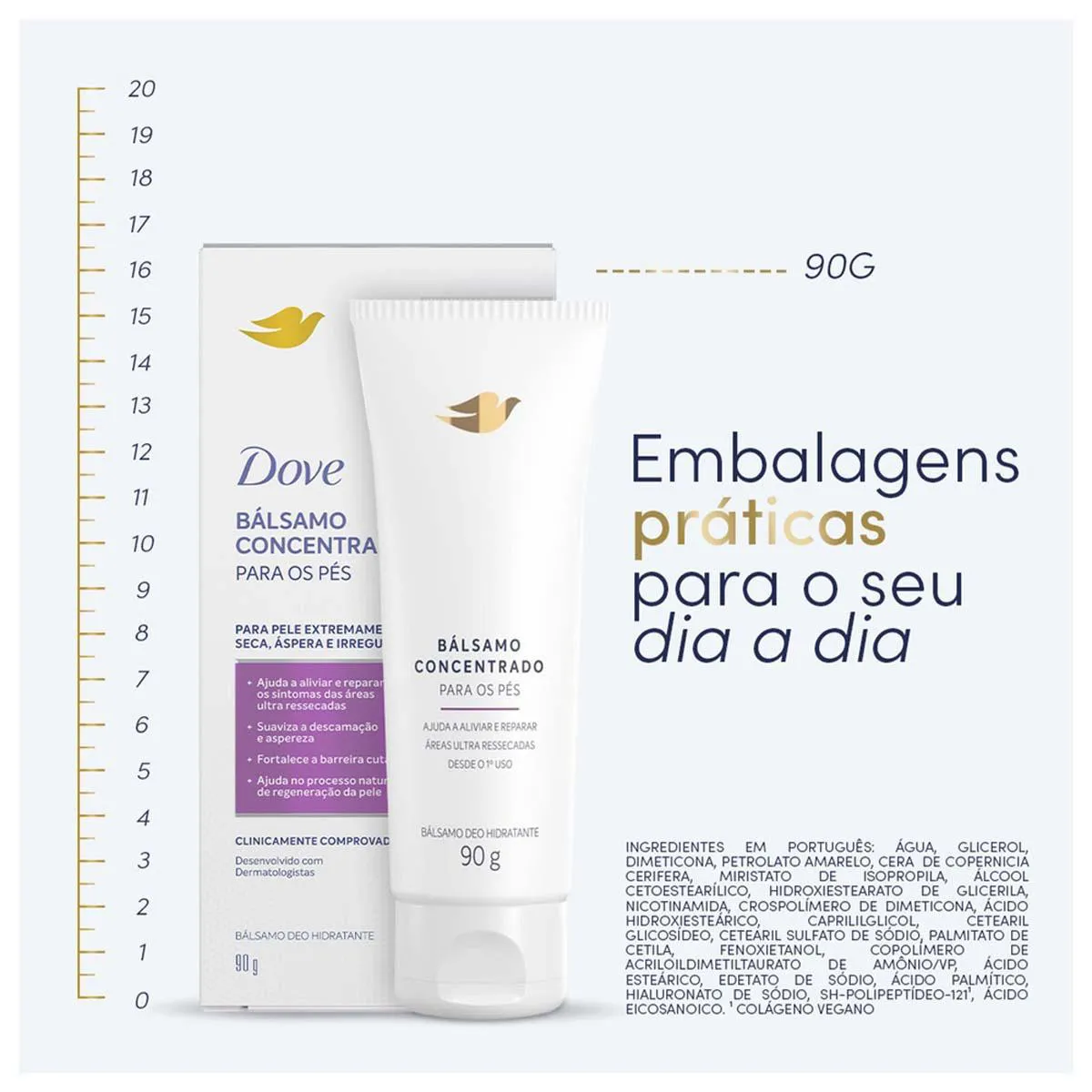 O bálsamo concentrado Dove é um produto para os pés clinicamente comprovado e desenvolvido em parceria com dermatologistas, além de ter sido testado em mulheres reais. Sua fórmula é dermatologicamente testada, não oleosa, com textura densa e de alta absorção, sem a presença de óleos ou parabenos e não testado em animais.