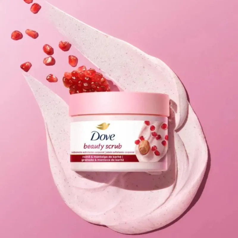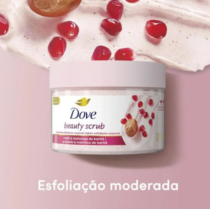 O Dove Beauty Scrub é um sabonete esfoliante desenvolvido para cuidar da pele, formulado com partículas esfoliantes naturais, ¼ de creme hidratante, romã e manteiga de karité. Possui textura suave e pH neutro, sem sulfatos.
