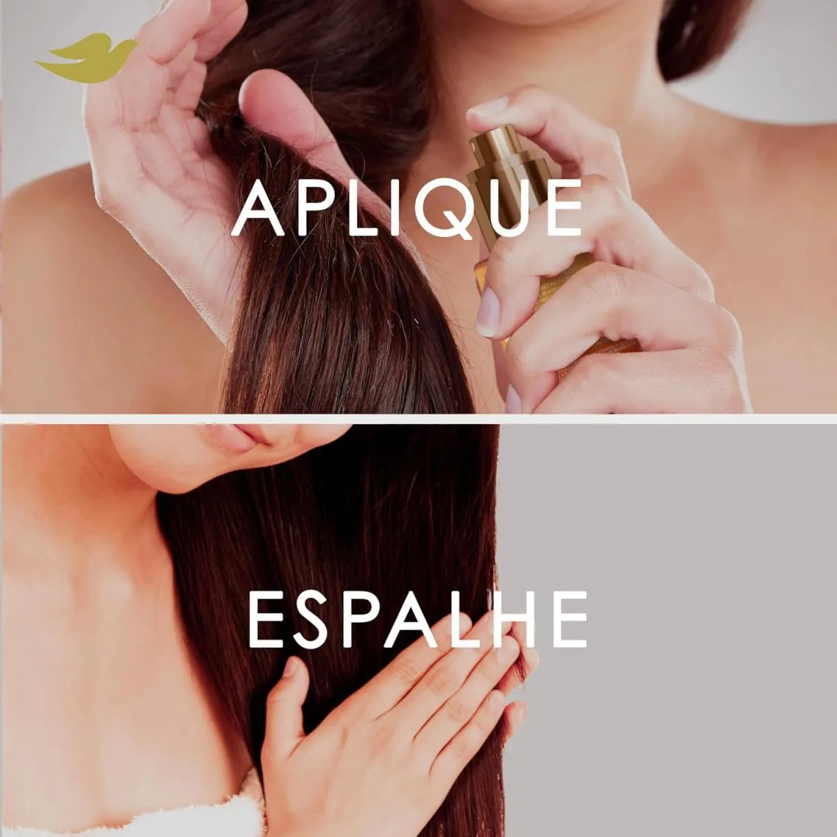 Agitar antes de usar para misturar as fases. Aplicar pequena quantidade nos cabelos úmidos ou secos, evitando a raiz. Evitar contato com os olhos. Em caso de irritação, suspender o uso. Guardar em local fresco e seco.