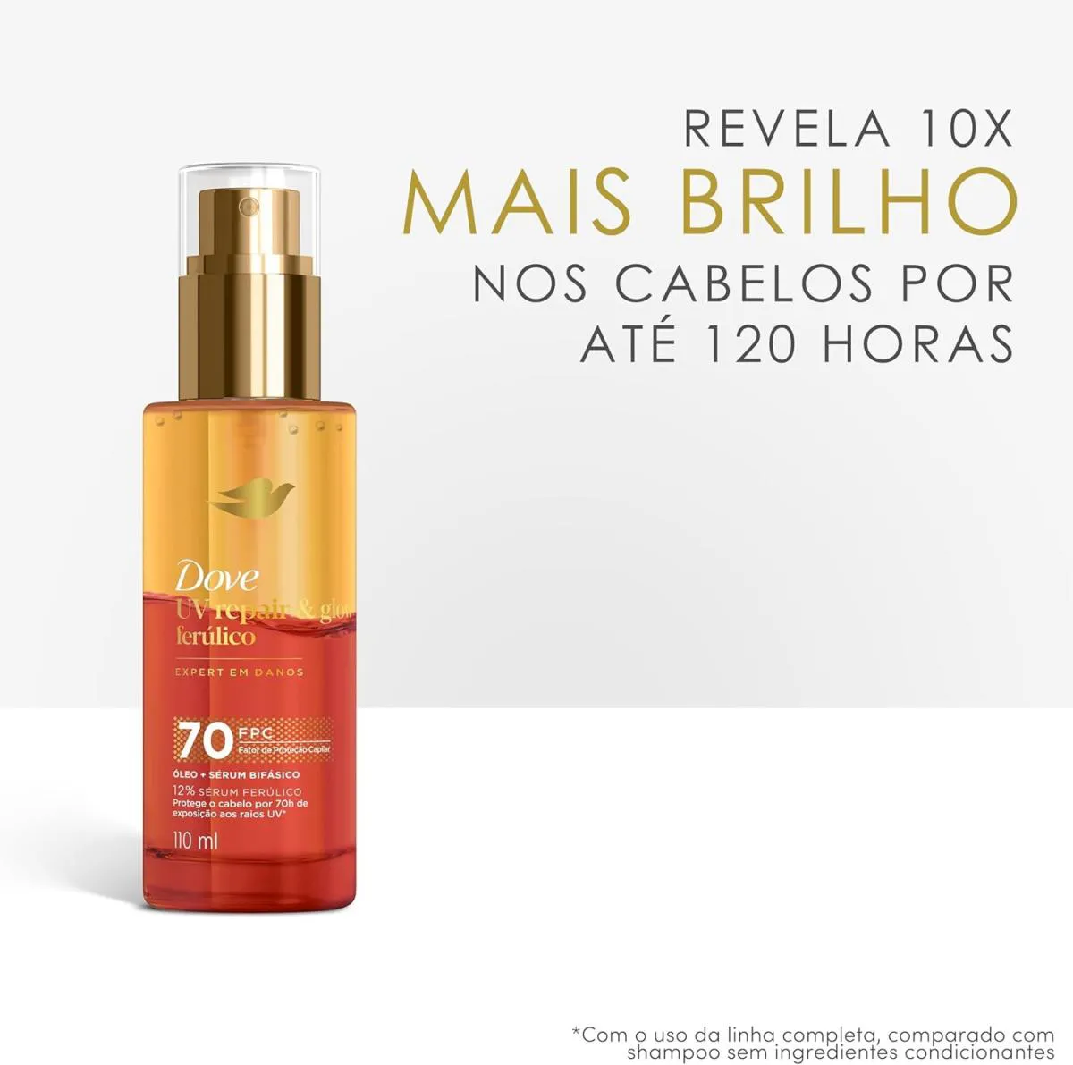 Dove UV Repair & Glow Ferúlico – Óleo + Sérum Bifásico 110 ml O Dove UV Repair & Glow Ferúlico é um tratamento capilar bifásico desenvolvido para reparar danos, proteger contra raios UV e trazer brilho imediato aos fios. Sua fórmula combina óleo nutritivo com 12% de sérum ferúlico, criando uma ação poderosa que fortalece, hidrata e melhora a aparência do cabelo desde o primeiro uso. Com FPC 70 (Fator de Proteção Capilar), o produto ajuda a preservar a fibra capilar por até 70 horas de exposição ao sol, evitando ressecamento, opacidade e danos causados pelos raios UV. Ideal para todos os tipos de cabelo, especialmente os que passam por rotinas frequentes ao ar livre. Benefícios: