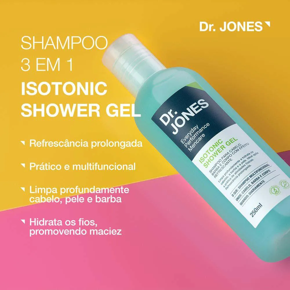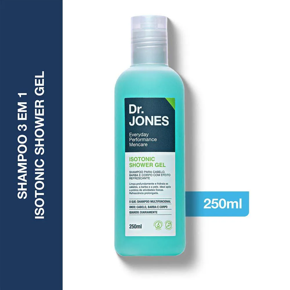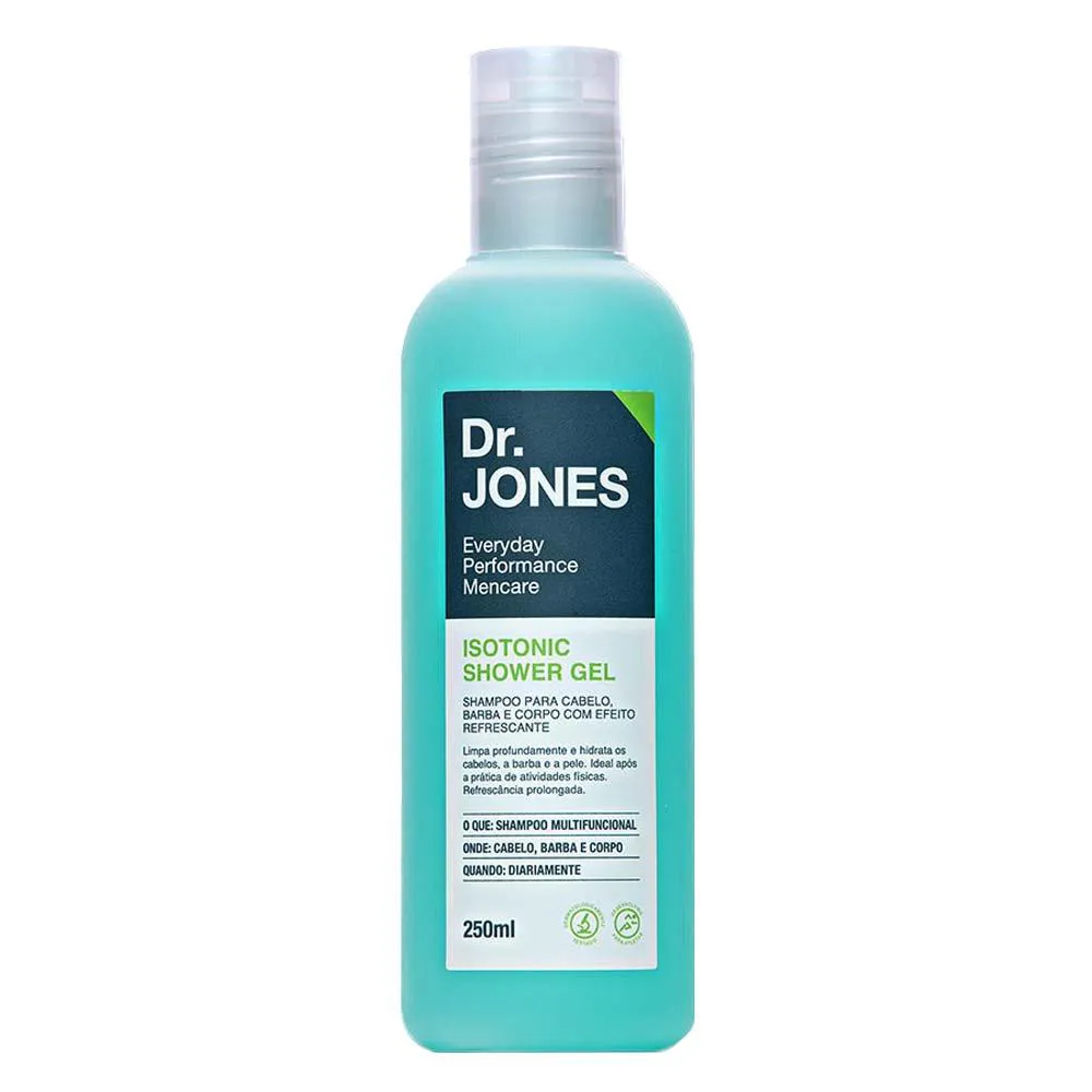 Isotonic Shower Gel da Dr. Jones é um shampoo em gel, ideal para cabelo e corpo que limpa profundamente a pele, a barba e o cabelo sem agredi-los. Shampoo 3 em 1.