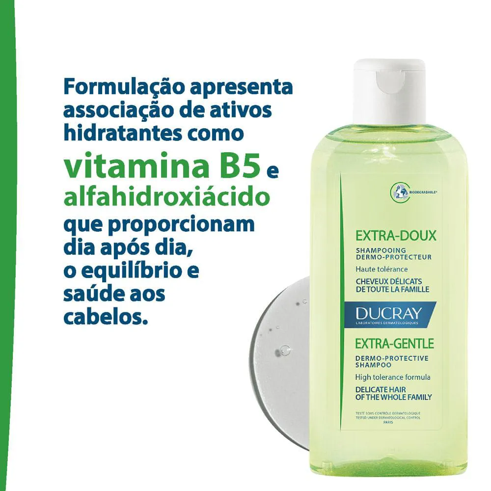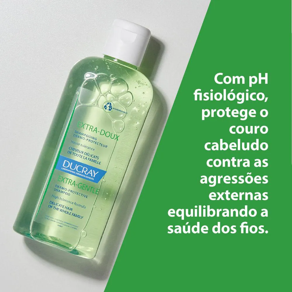 O Ducray Extra-Doux é um shampoo suave e delicado, livre de álcool, parabenos, petrolatos e silicone, desenvolvido para limpar os cabelos sem agredir os fios. Trata-se de um produto 100% biodegradável, com pH fisiológico e formulado para respeitar e proteger o couro cabeludo. É considerado o shampoo nº 1 na Europa e o primeiro produto 100% ecológico da marca Ducray. Sua composição permite alta tolerância, inclusive na região dos olhos, sendo adequado para todos os tipos de cabelo, especialmente os mais delicados.