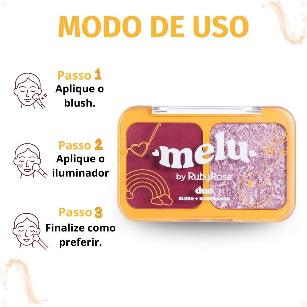 mãos um produto que não só embeleza, mas também cuida da sua pele. O Duo Blush e Iluminador Melu possui uma fórmula enriquecida com ativos hidratantes, garantindo que sua pele permaneça saudável e radiante durante o uso. Além disso, seu estojo compacto e elegante é perfeito para levar na bolsa, permitindo retoques rápidos e um visual sempre deslumbrante, não importa onde você esteja. Experimente a praticidade e o poder de um duo que realça sua beleza natural e te deixa pronta para qualquer ocasião.