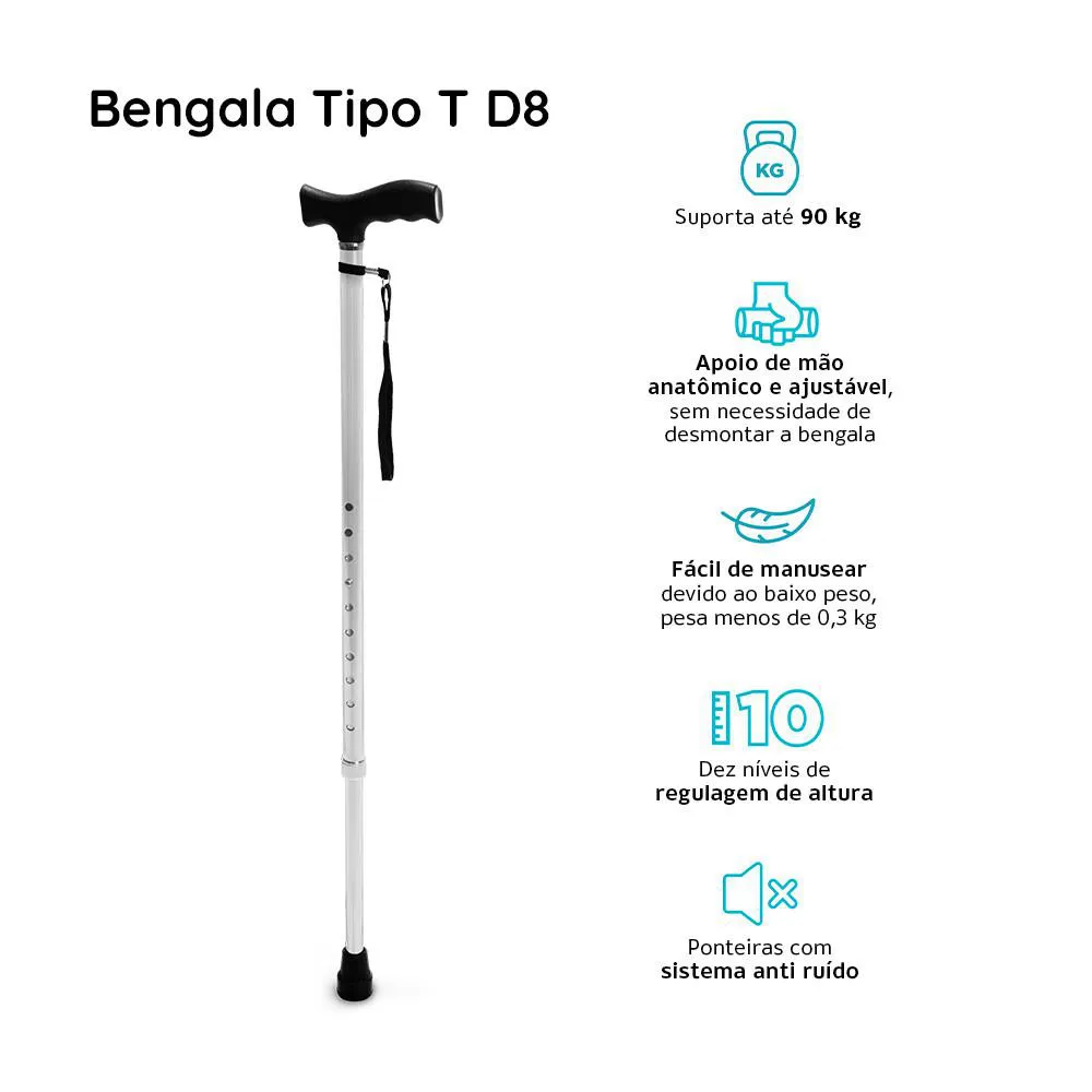 A Bengala Bastão Tipo T D8 Dellamed foi desenvolvida pensando na melhor forma de auxiliar adultos e idosos com dificuldade de equilíbrio e locomoção. A estrutura é de alumínio anodizado espelhado: leve, não risca, não perde o brilho e não enferruja. O apoio de mão é anatômico e a bengala dispõe de sistema antirruído (marcha silenciosa), sendo regulável em até 10 níveis de altura através de engate rápido por pino click.