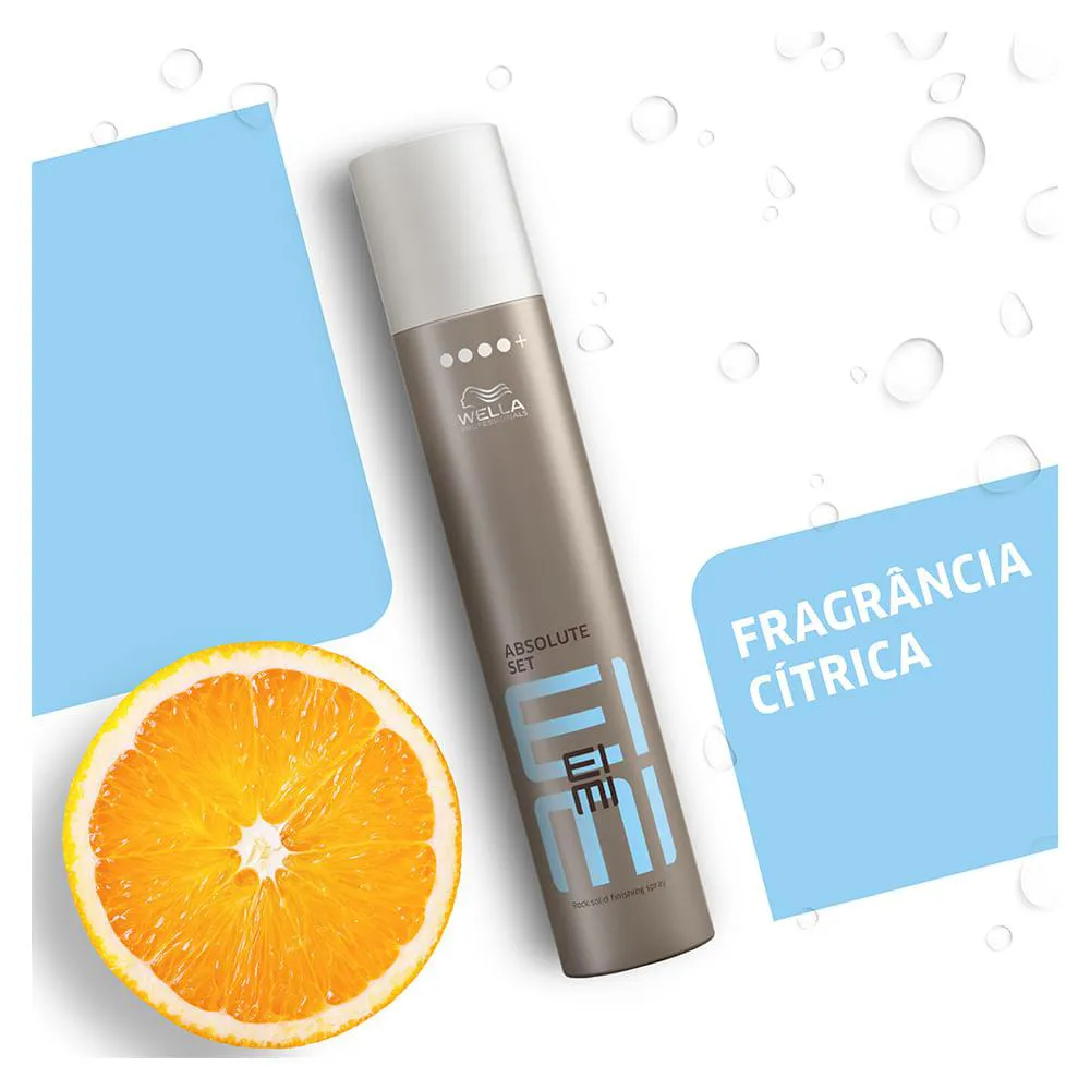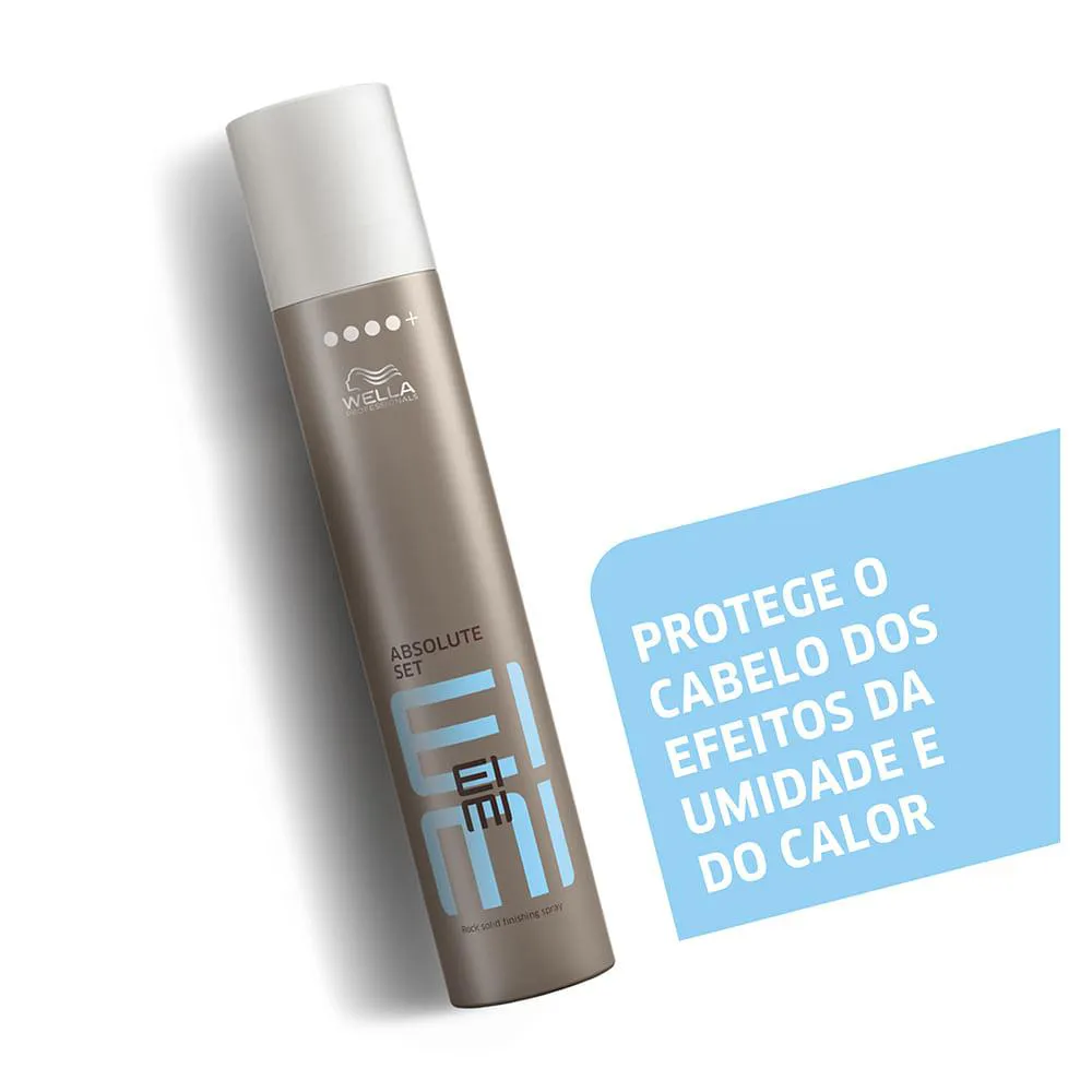 Wella Professionals EIMI Absolute Set é um spray de fixação extra forte. Possui fragrância cítrica. Proporciona fixação ultra forte para o acabamento do penteado. Formulado para ajudar a proteger o cabelo dos efeitos da umidade, dos raios UV e do calor. PENSE STYLING, DIGA EIMI.
