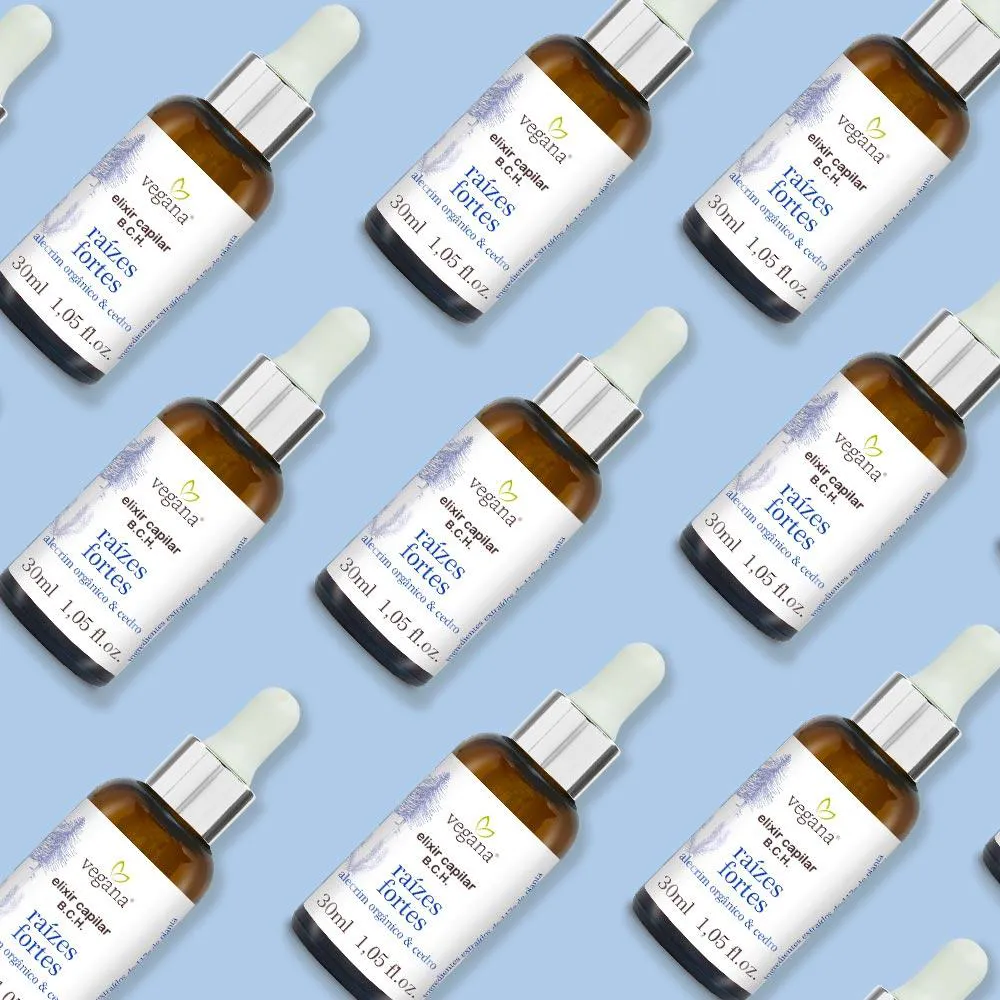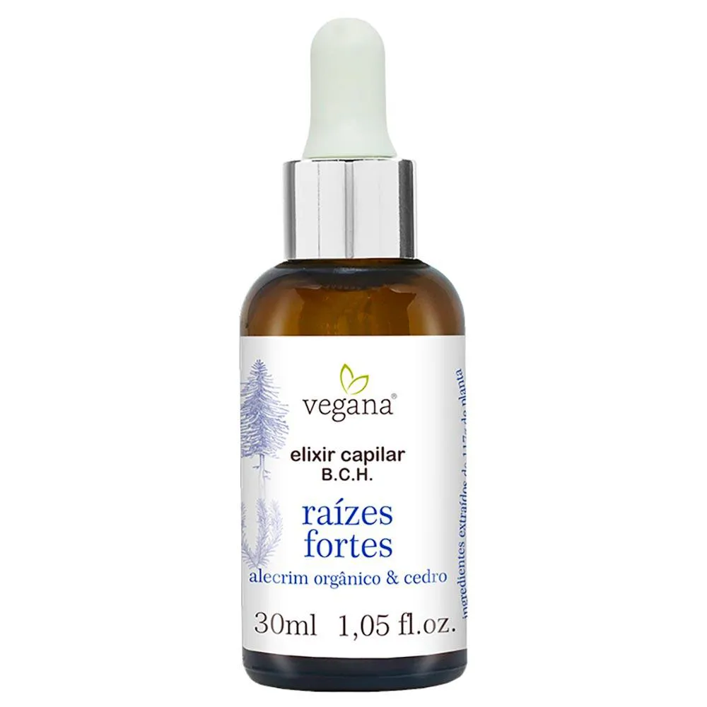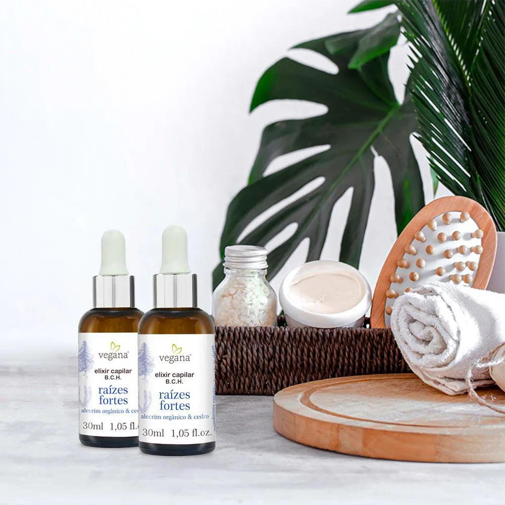 Fortalecimento. O Elixir B.C.H (Bulbo, Couro e Haste) Vegana Raízes Fortes contém os componentes necessários para reestabelecimento da saúde do couro cabeludo e desenvolvimento do bulbo capilar.