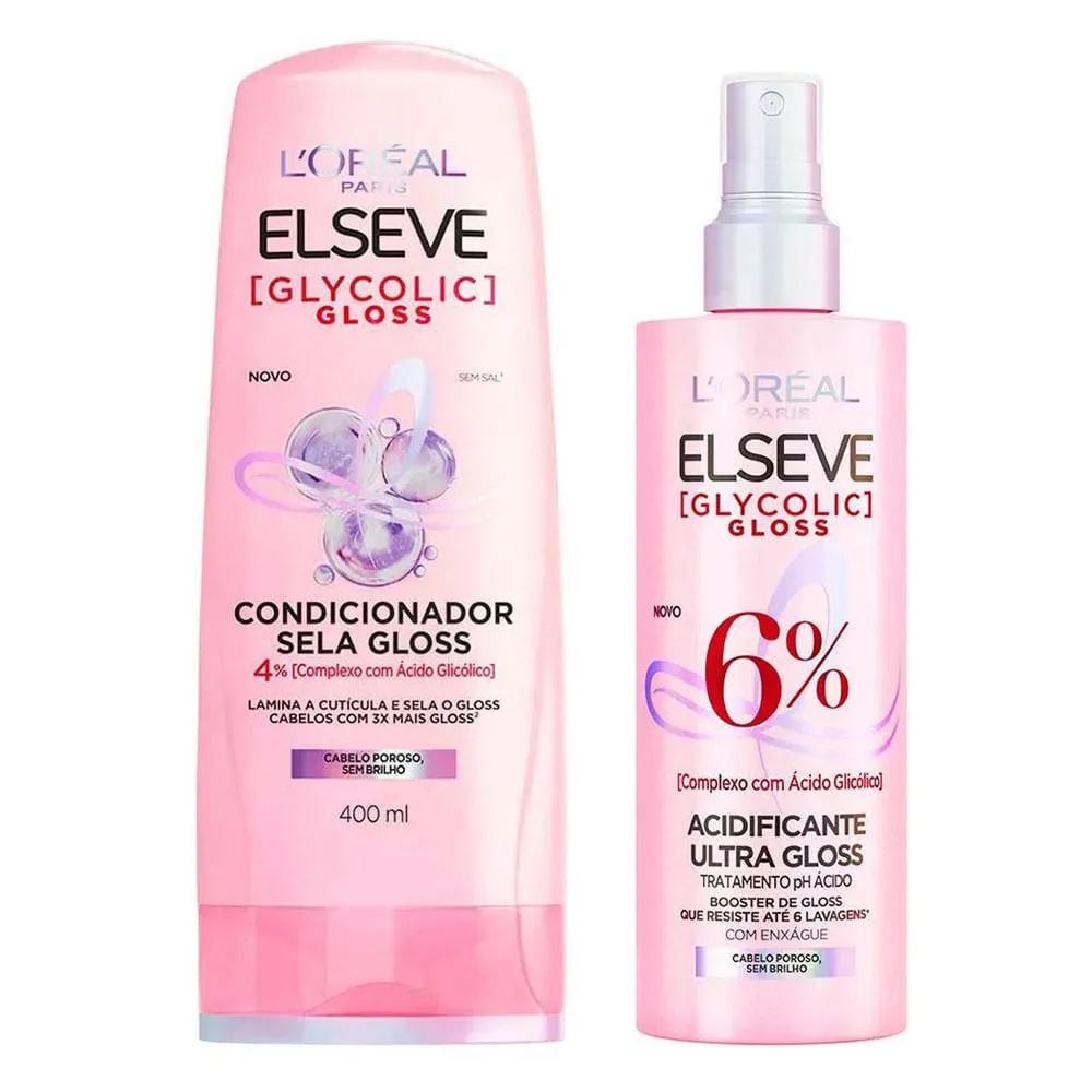 O kit é um conjunto de produtos capilares da linha Elseve Glycolic Gloss da L'Oréal Paris, composto por um Condicionador Sela Gloss e um Tratamento Acidificante Ultra Gloss, desenvolvidos para melhorar a aparência e a saúde dos cabelos.