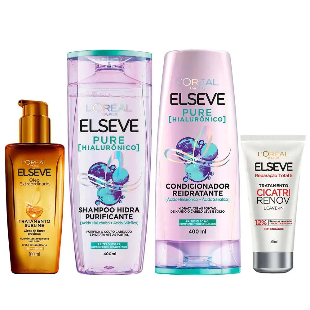 Elseve Pure Hialurônico Kit – Shampoo + Condicionador + Óleo Extraordinário + Leave In Tratamento