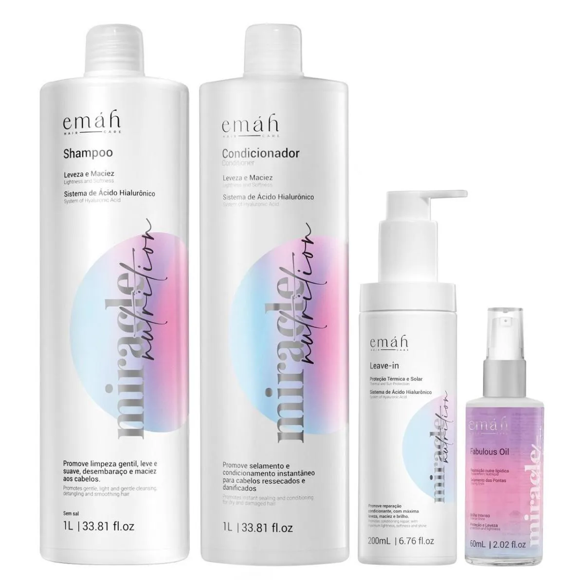Kit Essencial Emáh Miracle Nutrition: shampoo 1L + condicionador 1L + Leave-in 200ml + Óleo 60ml
