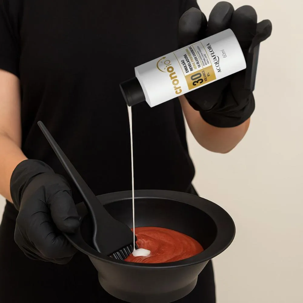Misture a Emulsão Reveladora Acquaflora Crono10 30 volumes 60ml com a coloração seguindo as proporções indicadas pelo fabricante do produto a ser utilizado. Aplique nos cabelos conforme as instruções do processo de coloração escolhido.