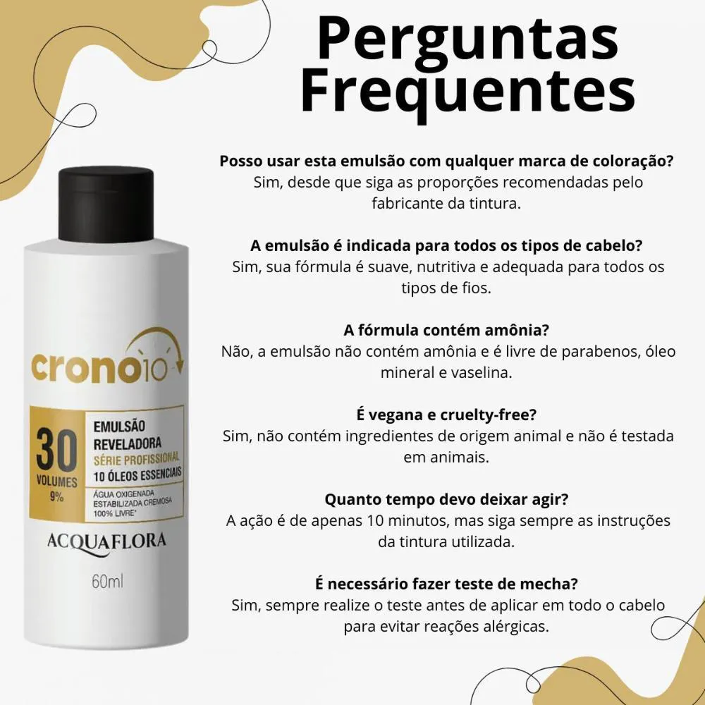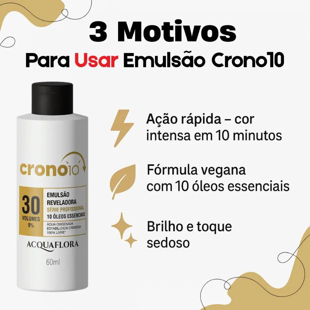 A Emulsão Reveladora Acquaflora Crono10 30 volumes 60ml é ideal para ser utilizada em processos de coloração capilar, seja em salões de beleza ou para uso doméstico, garantindo uma ativação de cor rápida e eficiente.Instruções de Cuidado/Remoção