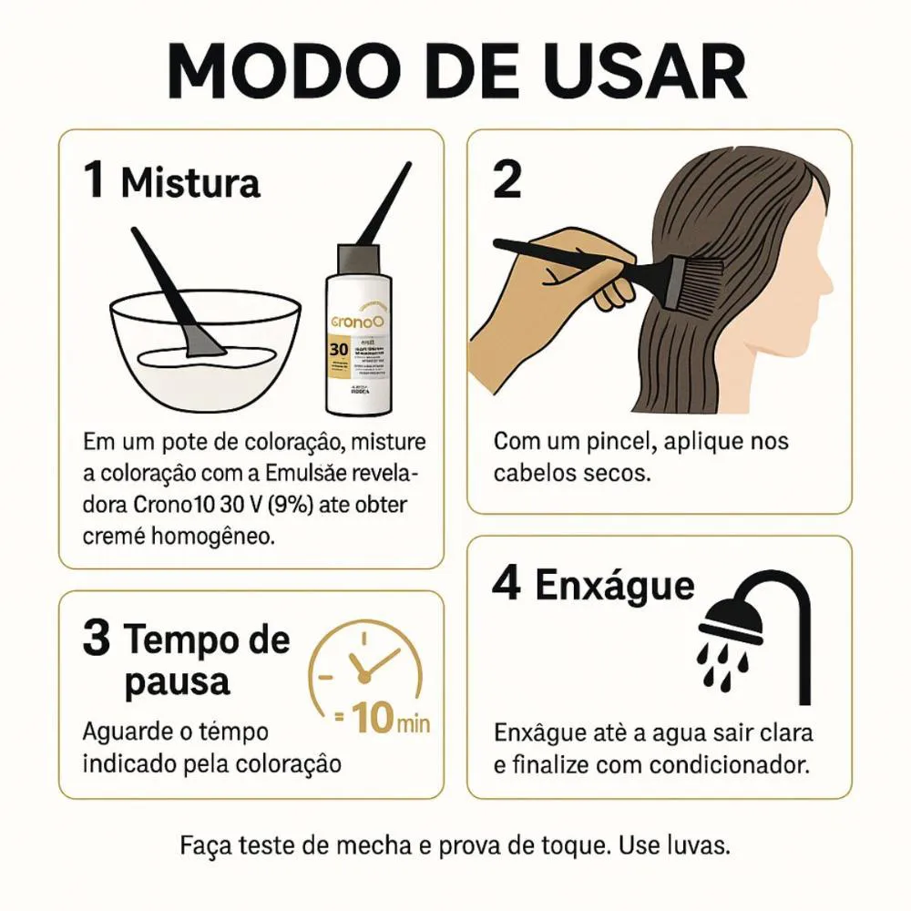 É fundamental realizar o teste de mecha e prova de toque antes da aplicação completa para verificar a compatibilidade e evitar reações alérgicas.Modo de Uso/Aplicação