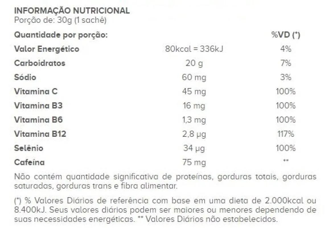 Endurance Caffeine Gel (360g - 12 Saches) - Vitafor Endurance Caffeine Gel da Vitafor é um suplemento em gel, e carboidratos, cafeína, vitaminas e mineral em gel que tem como diferenciais um Blend de carboidratos, vegano, 60mg de sódio por porção (sabor chocolate belga), 57mg de sódio por porção (sabor mocha), Consistência mais fluida para facilitar o consumo e 75mg de cafeína por porção! O Endurance Caffeine Gel é ideal para alcançar seus objetivos e te levar mais longe! Ciclistas, nadadores, maratonistas, lutadores, jogadores de futebol, praticantes de musculação e tantos outros esportistas se beneficiam desta formulação. Ao ingerir antes ou durante o treino, o endurance Caffeine Gel proporciona energia para exercícios de longa duração. Benefícios:* A cafeína auxilia no aumento do estado de alerta e na melhora da concentração;* A vitamina c e o selênio são antioxidantes que auxiliam na proteção dos danos causados pelos radicais livres;* A vitamina C, vitamina B6, vitamina B12 e o selênio auxiliam no funcionamento do sistema imune;* A niacina (vitamina B3), a vitamina B6, vitamina B12 e a vitamina C auxiliam no metabolismo energético;* A niacina (vitamina B3), a vitamina B6 e a vitamina B12 auxiliam no metabolismo de proteínas, carboidratos e gorduras e a vitamina C auxilia no metabolismo de proteínas e gorduras;* A vitamina C auxilia na formação do colágeno, na absorção de ferro dos alimentos e na regeneração da forma reduzida da vitamina e;* A vitamina B6 auxilia no metabolismo de proteínas e do glicogênio e na síntese de cisteína;* A niacina (vitamina B3) contribui para a manutenção da pele e auxilia na manutenção de mucosas;* Vegano;* Consistência mais fluida para facilitar o consumo;* Prático na versão em sachês para utilização durante os exercícios;* Excelente sabor;* Possui excelentes fontes de carboidratos, como a D-ribose, um carboidrato de rápida absorção.