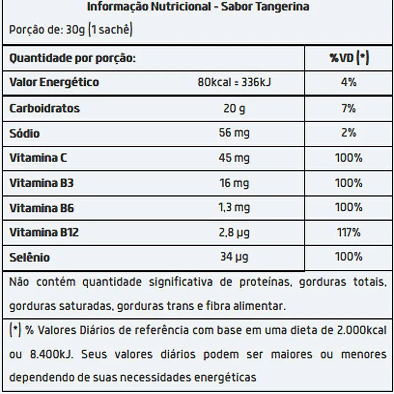 • Consistência mais fluida para facilitar o consumo; Ingredientes: Maltodextrina, água, frutose em pó, D-ribose, ácido ascórbico (vitamina C), cloreto de sódio, niacinamida (vitamina B3), levedura enriquecida em selênio (selênio), cloridrato de piridoxina (vitamina B6), cianocobalamina (vitamina B12), acidulantes: citrato de sódio, citrato de potássio e ácido cítrico, aroma idêntico ao natural de tangerina, corante natural urucum e conservantes: sorbato de potássio e benzoato de sódio.